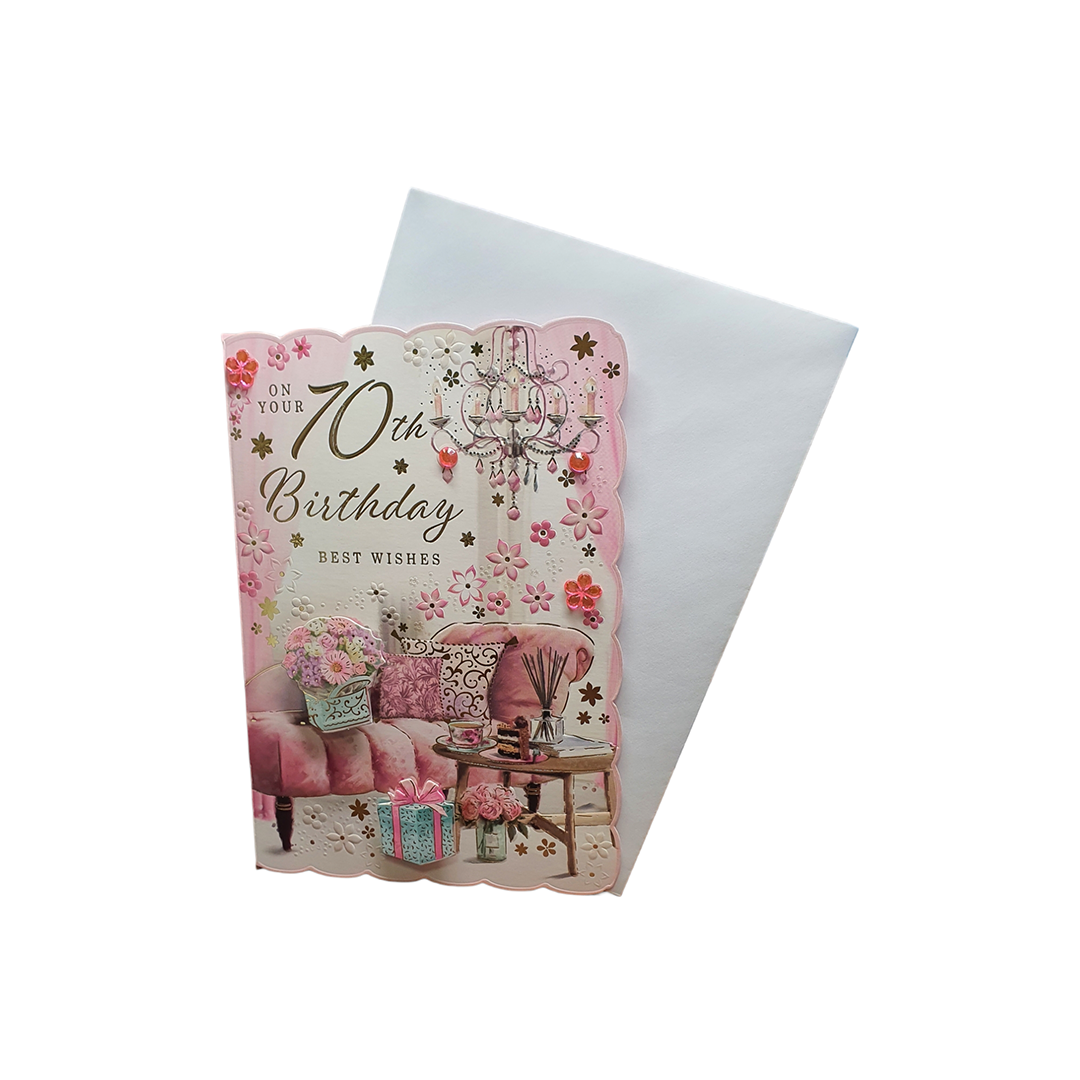 - Celebrate your 70th birthday card for Female with Happy Birthday Wishes "Express Yourself" birthday card! Featuring a Pink design of old house sofa and gift with best Happy birthday wishes , this card is sure to bring a smile to your loved one face.