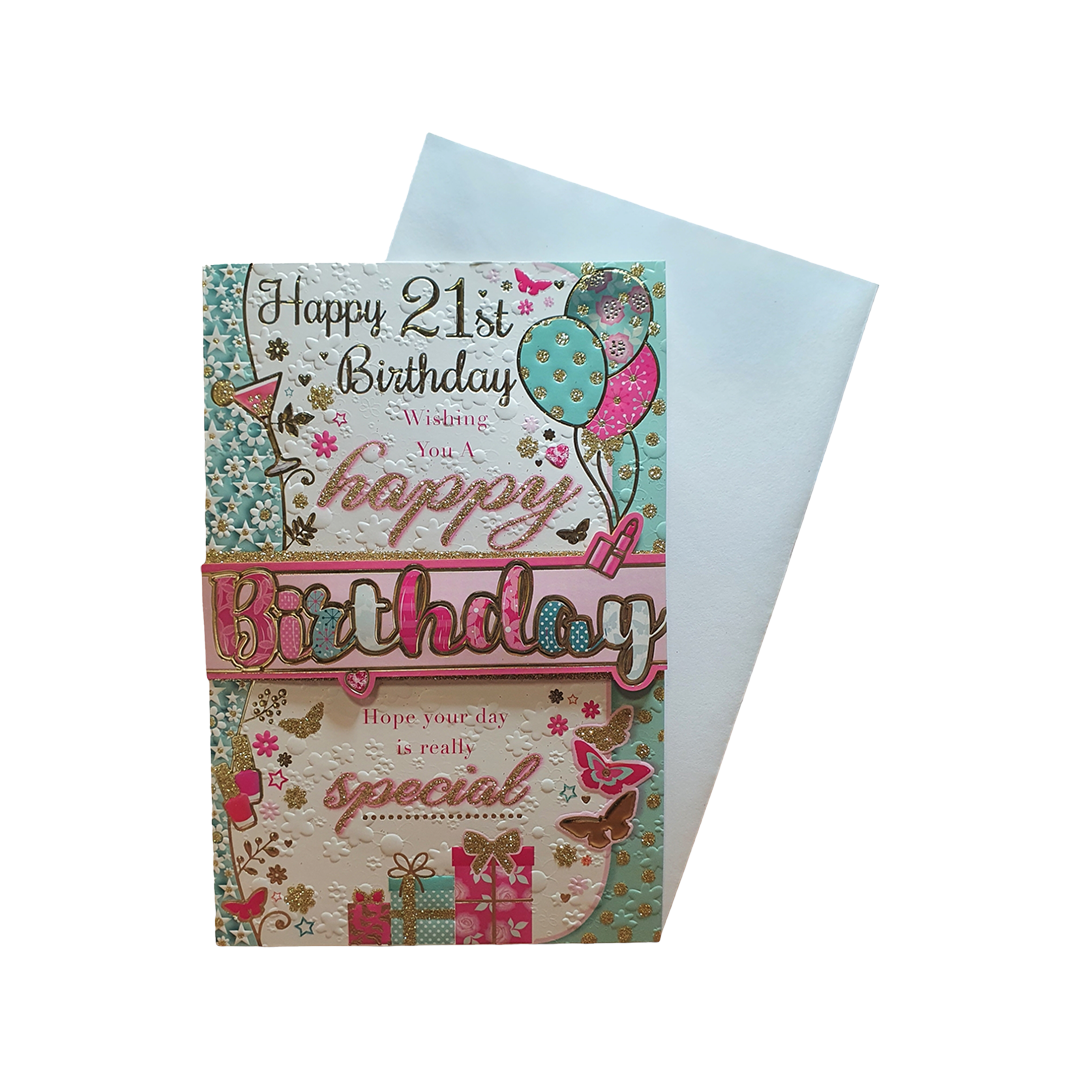 Celebrate special 21st Happy Birthday Greeting Card This delightful card is the perfect way to convey your heartfelt birthday wishes and make the recipient's day even more joyful. With its vibrant design and thoughtful message, this card adds an extra layer of happiness and thoughtfulness to your birthday greetings.