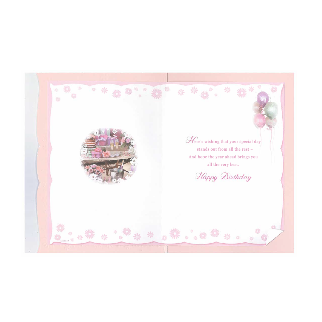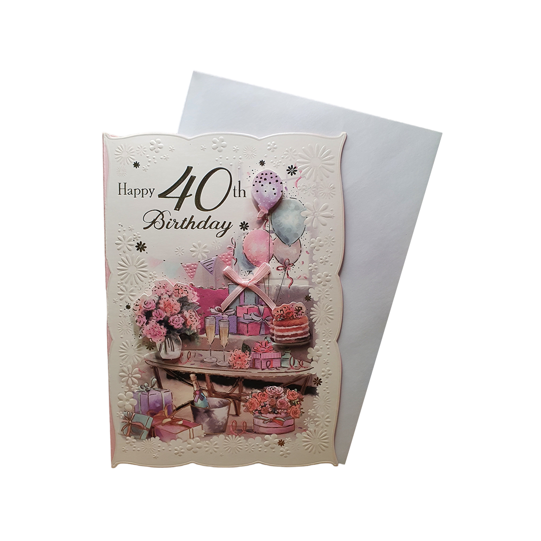 Celebrate your 40th birthday with Happy Birthday Wishes birthday card! Featuring a beautiful pink flowers & gifts . The perfect way to wish someone a fantastic 40th birthday and mark this significant moment in their life. The card also comes with an envelope, making it the perfect all-in-one gift. Crafted from high-quality materials.