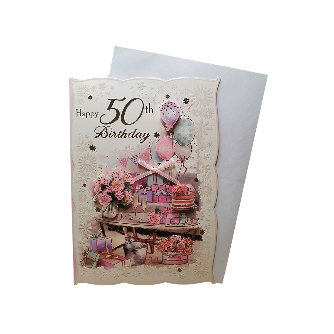 - Celebrate your 50th birthday with Happy Birthday Wishes birthday card! Featuring a beautiful pink flowers & gifts.