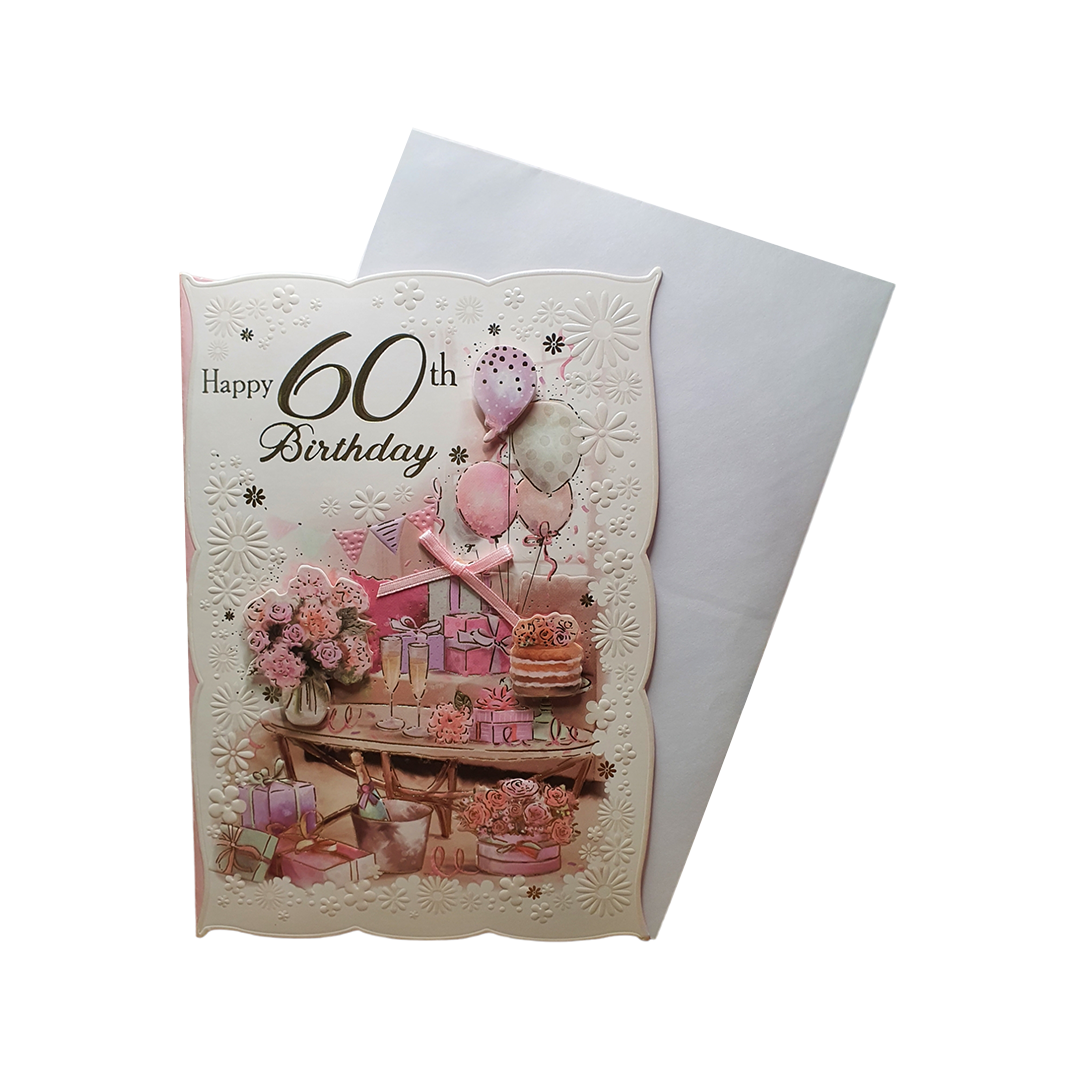 Celebrate your 60th birthday with Happy Birthday Wishes birthday card! Featuring a beautiful pink flowers & gifts . The perfect way to wish someone a fantastic 60th birthday and mark this significant moment in their life. The card also comes with an envelope, making it the perfect all-in-one gift. Crafted from high-quality materials.