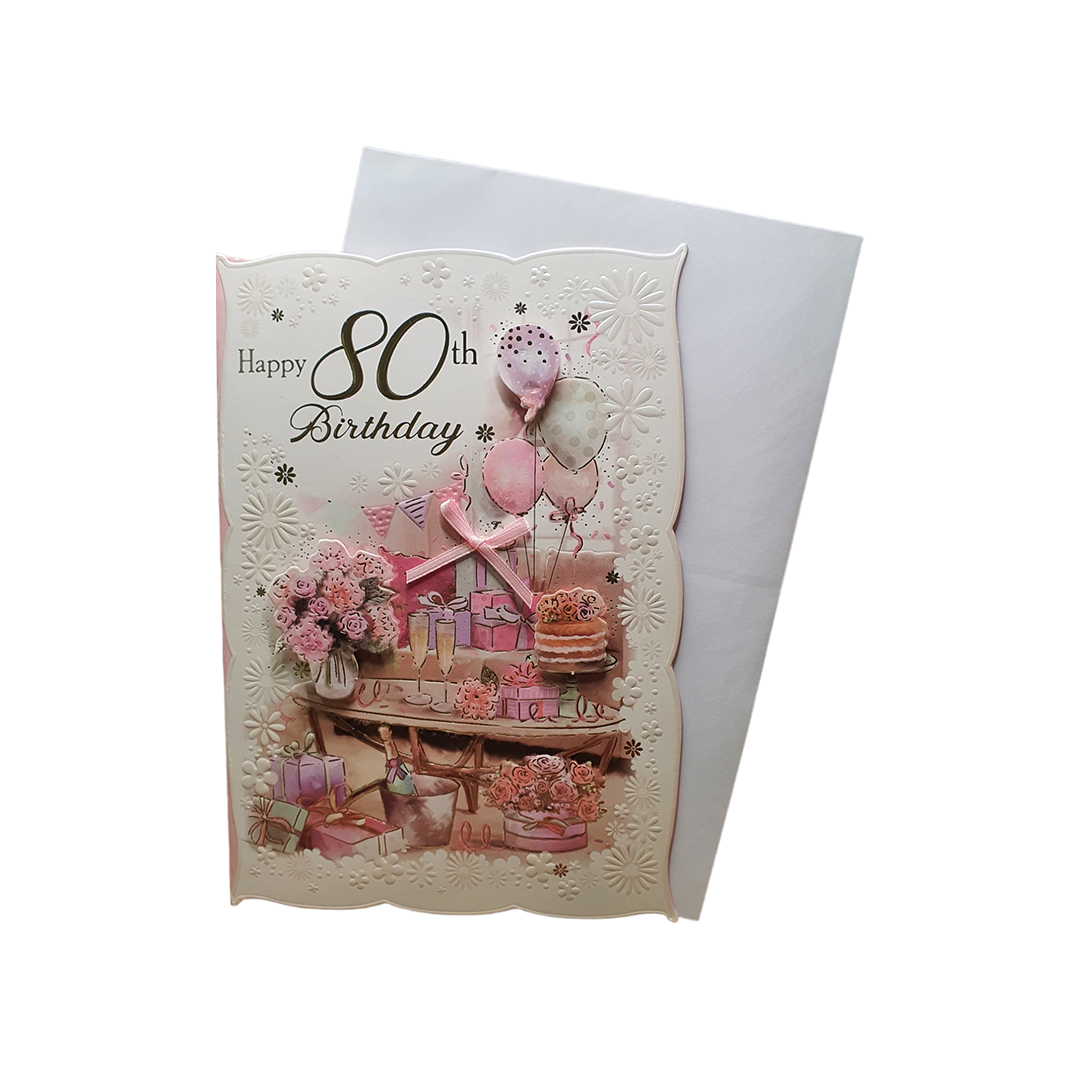 Celebrate your 80th birthday with Happy Birthday Wishes birthday card! Featuring a beautiful pink flowers & gifts . The perfect way to wish someone a fantastic 80th birthday and mark this significant moment in their life. The card also comes with an envelope, making it the perfect all-in-one gift. Crafted from high-quality materials.