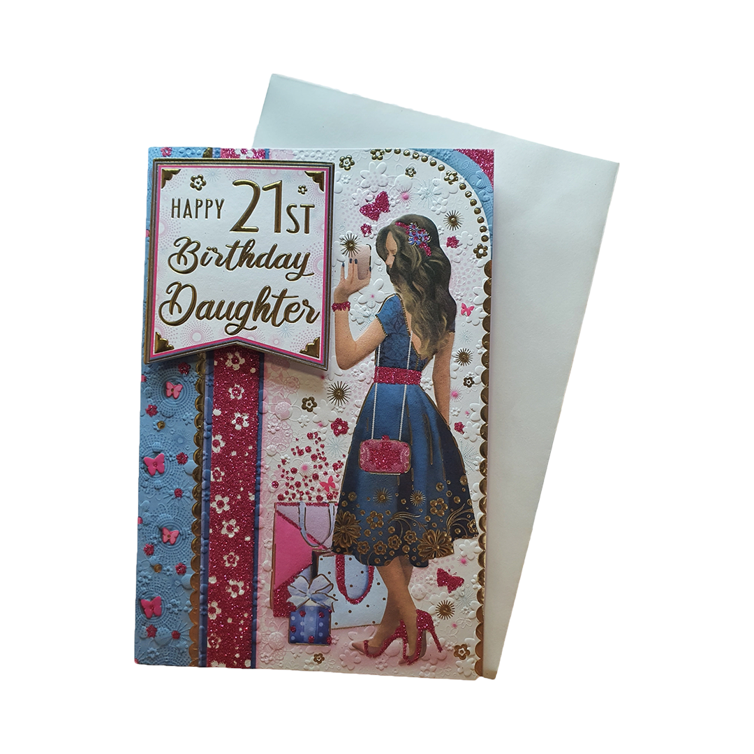 Celebrate birthday for a 21st daughter happy birthday Greeting Card. This delightful card is the perfect way to convey your heartfelt birthday wishes and make the recipient's day even more joyful. With its vibrant design and thoughtful message, this card adds an extra layer of happiness and thoughtfulness to your birthday greetings.
