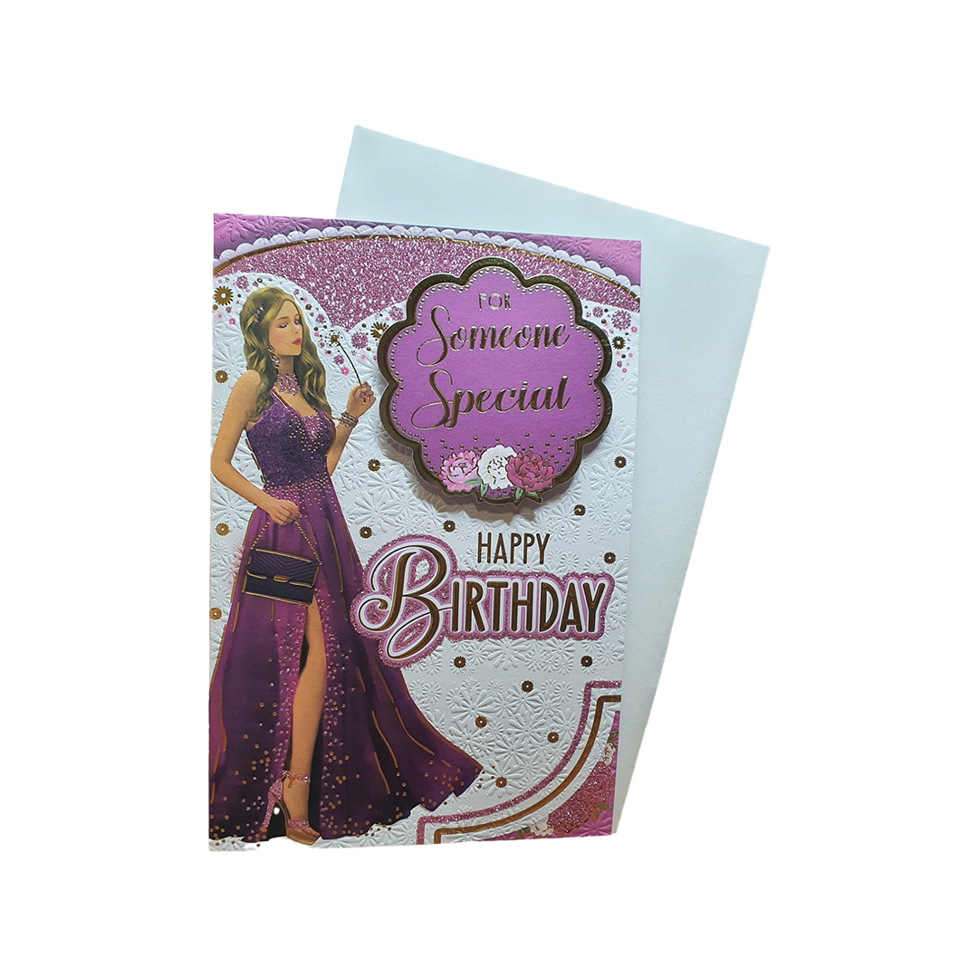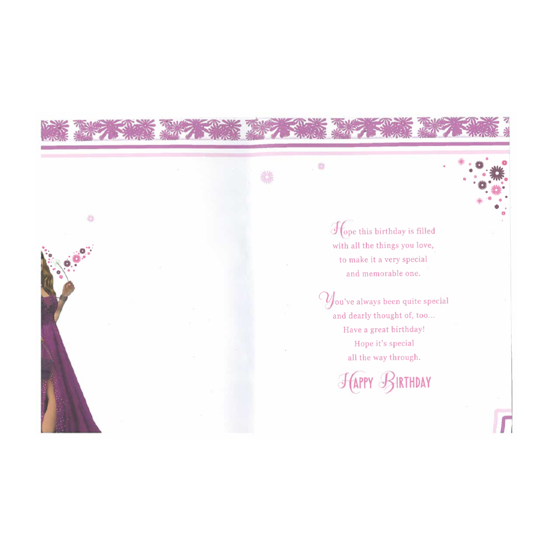 Birthday Card For A Someone Special Happy Birthday – Standing beautiful girl wearing purple western cloth and purse held in one hand.