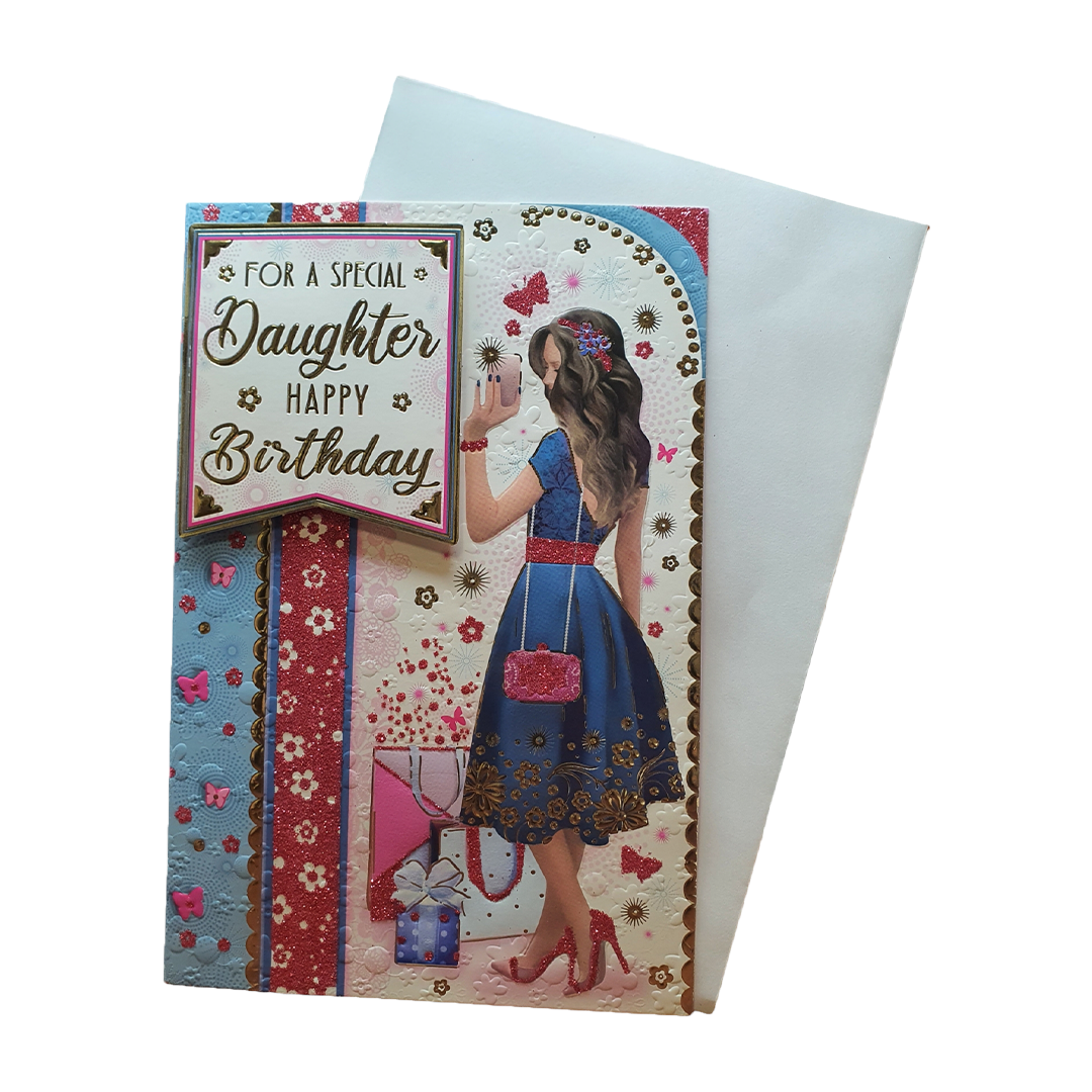 Celebrate birthday for a special Daughter happy birthday Greeting Card. This delightful card is the perfect way to convey your heartfelt birthday wishes and make the recipient's day even more joyful. With its vibrant design and thoughtful message, this card adds an extra layer of happiness and thoughtfulness to your birthday greetings.