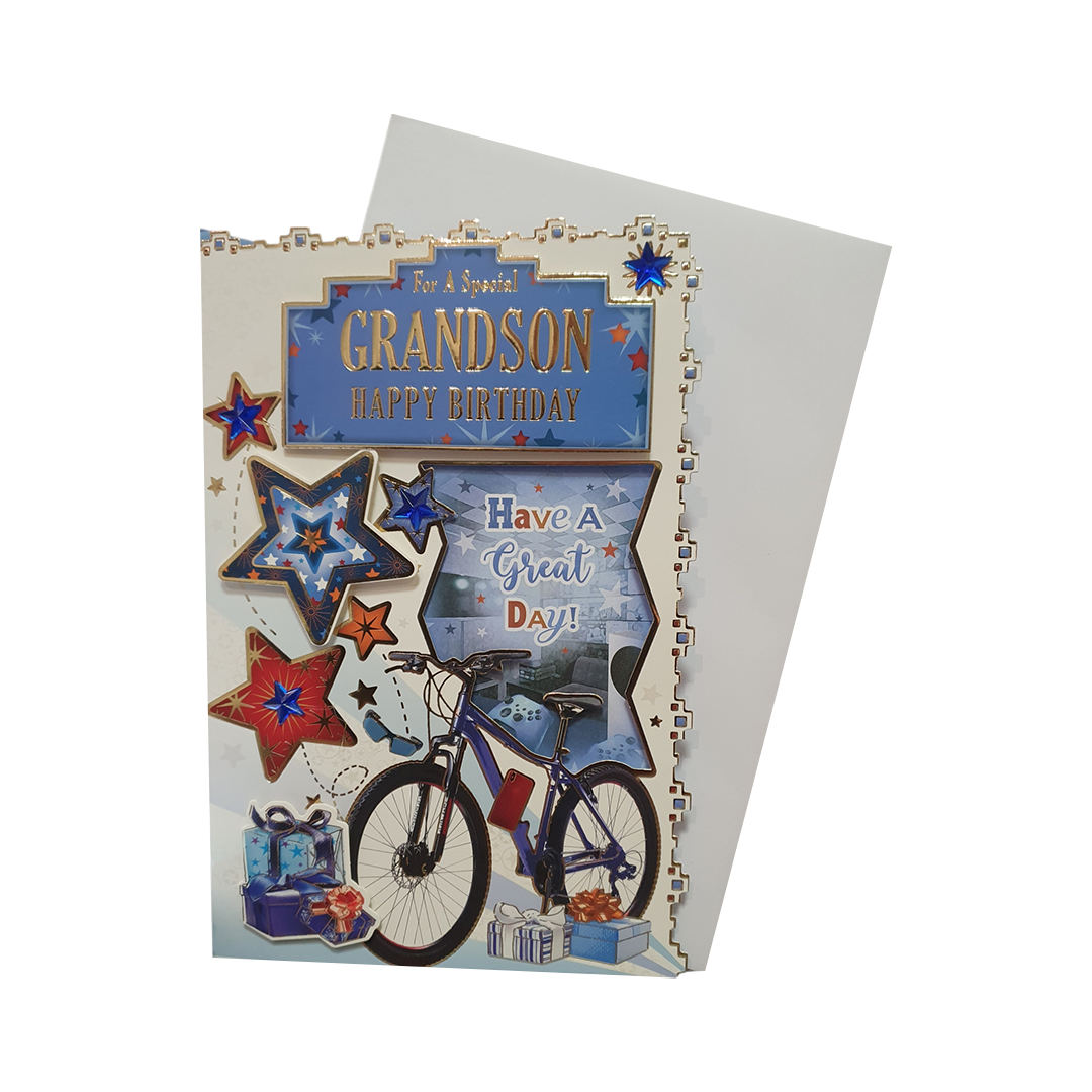 Celebrate special birthdays For A Special Grandson Greeting Card This delightful card is the perfect way to convey your heartfelt birthday wishes and make the recipient's day even more joyful. With its vibrant design and thoughtful message, this card adds an extra layer of happiness and thoughtfulness to your birthday greetings.
