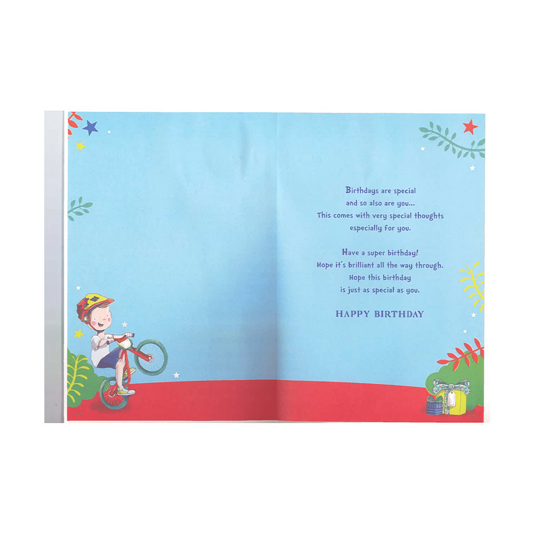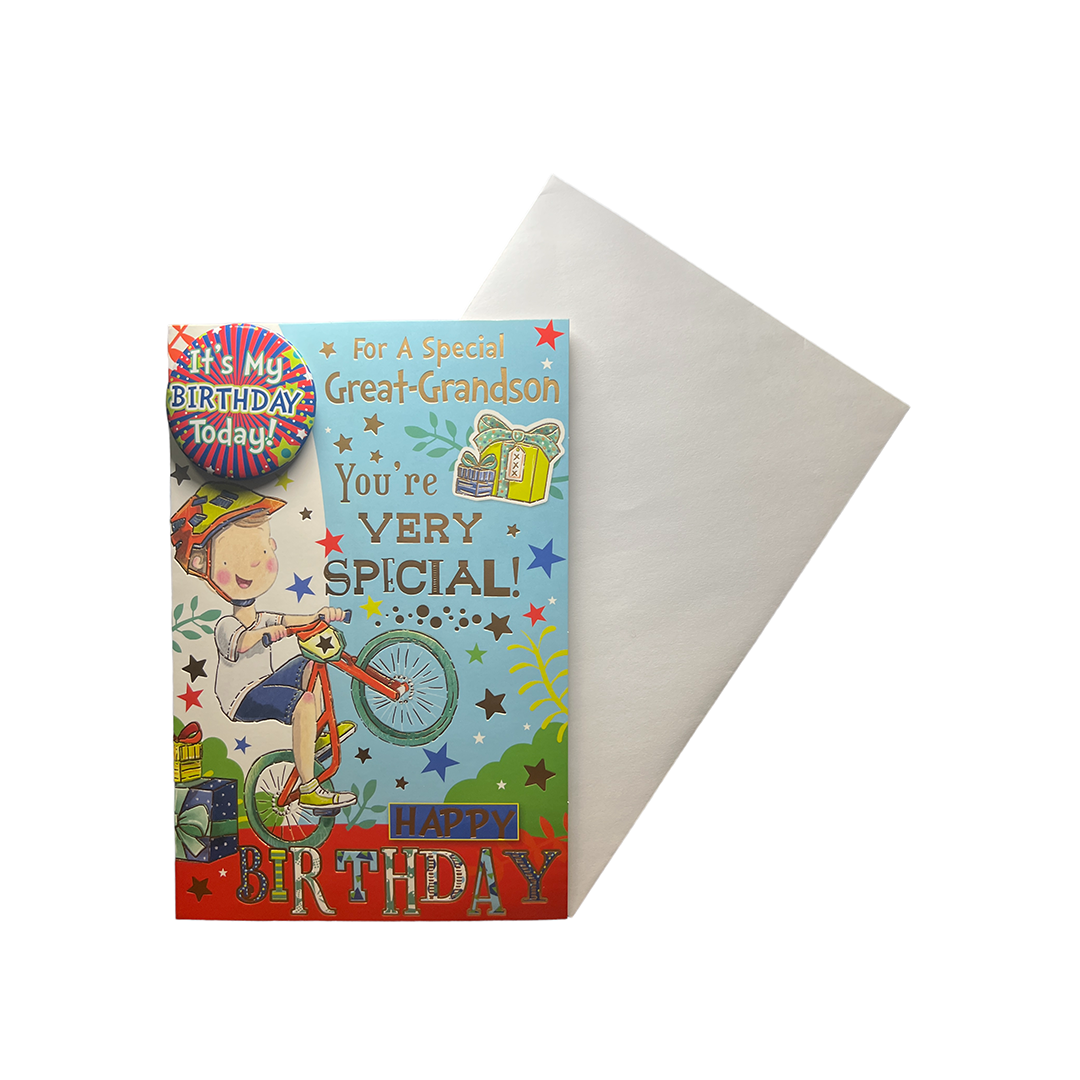 Celebrate your great grandson's special day with this birthday card. The card features an animated design of a little boy riding his bicycle, perfect for any active and adventurous great grandson. The card comes with a matching envelope and badge, making it easy to send your love and best wishes. This card is suitable for any great grandson who loves the outdoors and adventure. The playful and lively design is perfect for helping him express himself on his special day. The blue font of the card adds to the fun and adventurous theme and is sure to be a hit with any great grandson.