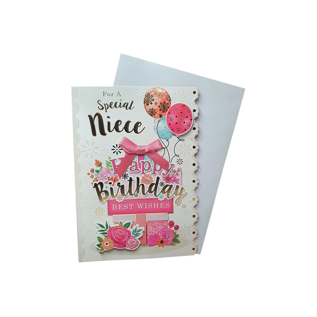 - Celebrate your Special Niece with Happy Birthday Wishes "Express Yourself" birthday card! Featuring a pink satin ribbon, this card is sure to bring a smile to your Niece face.