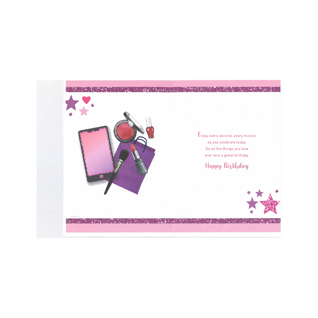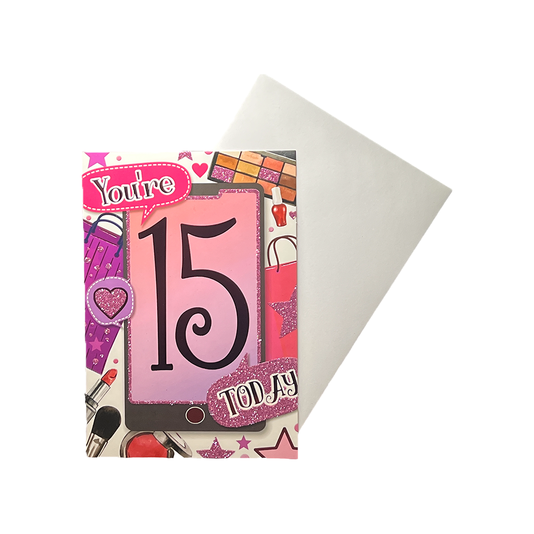 Make her birthday even more special with this brand birthday card, featuring a stylish makeup accessories design. Measuring 19x13.3 centimetres, this card comes with an envelope for easy gifting. The perfect choice for any teenage girl celebrating her 15th birthday, this card is sure to bring a smile to her face. With its high-quality design and attention to detail, this card is the perfect way to express your love and appreciation for the special young lady in your life.