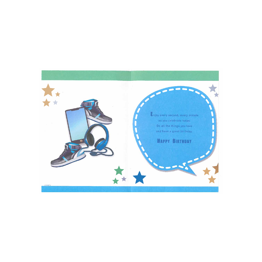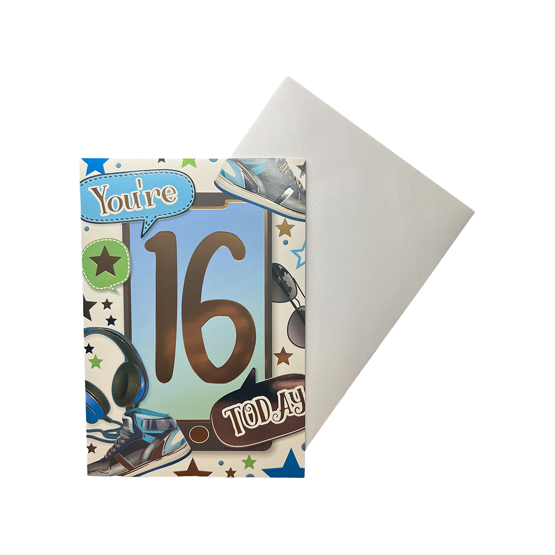 Celebrate your favorite guy's 16th birthday with this stylish brand birthday card! The card measures 19x13.3 centimetres and includes an envelope for easy mailing or gifting. The front of the card features a cool design with sneakers and sunglasses, perfect for any fashionable teenager. Whether you're near or far, this birthday card will bring a smile to your special guy's face and let him know how much you care.