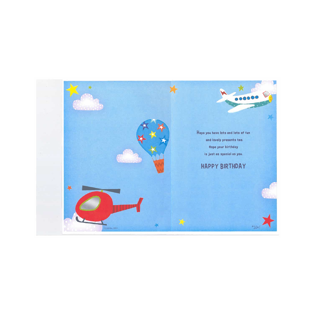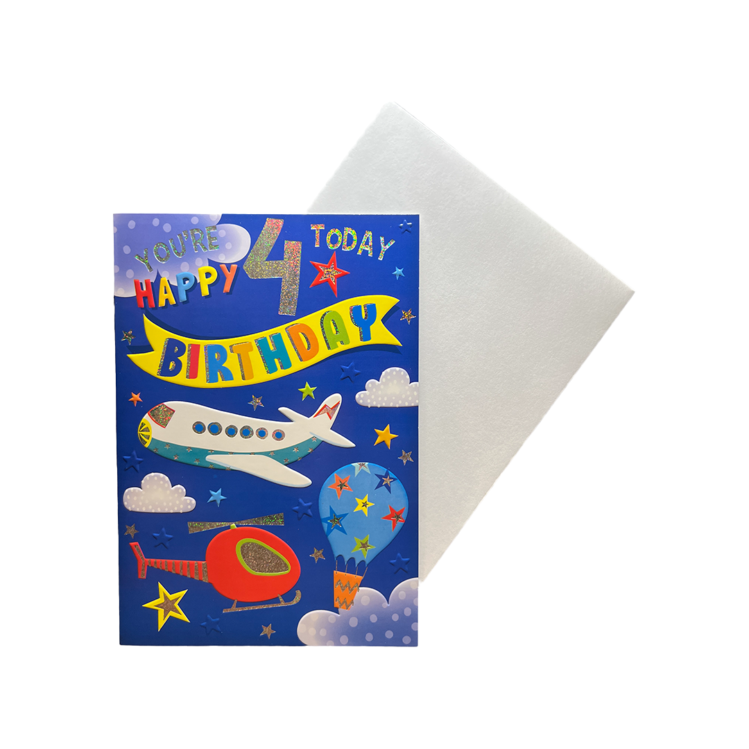 Celebrate any little one's 4th birthday with this fun and colorful birthday card! Featuring a playful design of planes, helicopters, and hot air balloons, this card is sure to bring a smile to any young boy's face. Measuring 19x13.3 cm, it's the perfect size for mailing or handing over in person. The card includes an envelope for easy sending and is blank inside, so you can personalize your message to make it extra special. Whether your little one is into planes or just loves bright colors, this card is sure to make their birthday even more memorable.