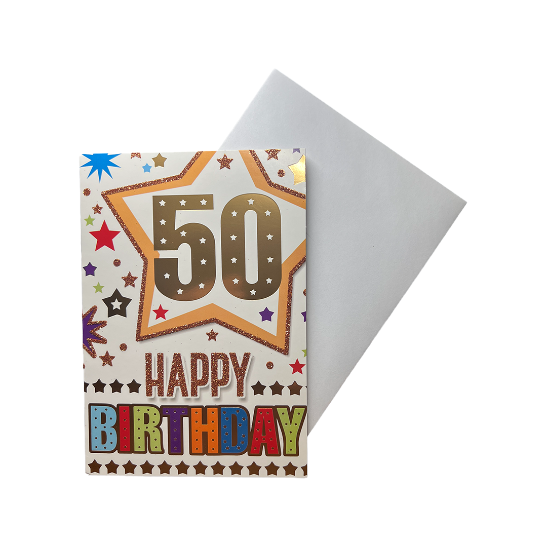 Make the birthday of your favorite 50-year-old male extra special with this stunning birthday card featuring a beautiful golden star design. This card is perfect for celebrating a milestone birthday and is sure to make the recipient feel extra special on their big day. Measuring 19x13.3 centimetres, this card is the perfect size to include a heartfelt message to the birthday. It comes with an envelope included, making it easy to send in the mail or give in person.