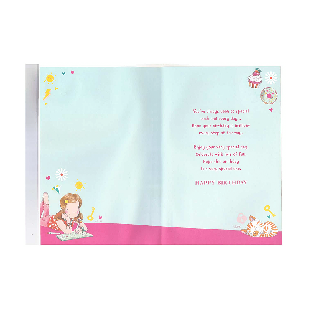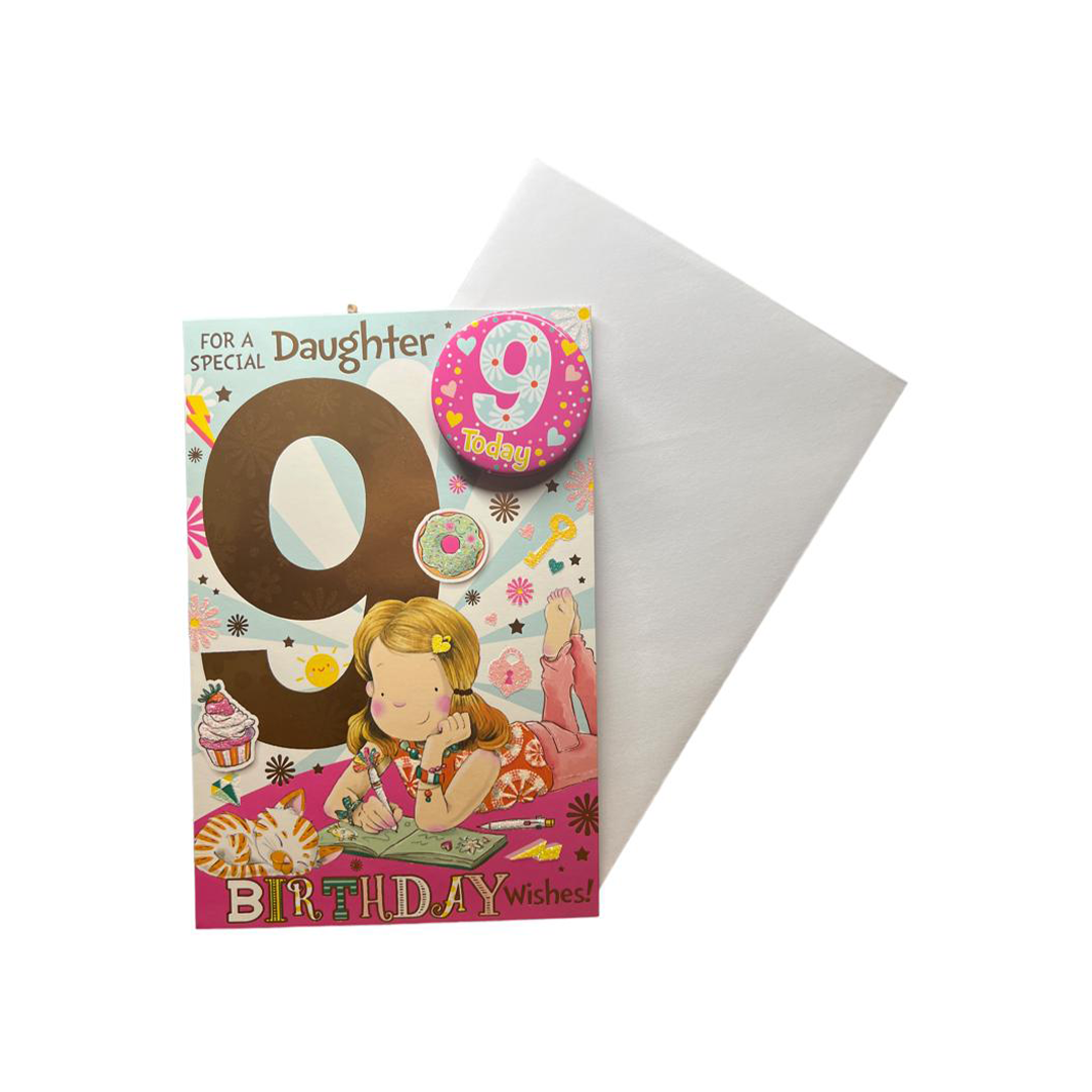 Celebrate your daughter's 9th birthday with this charming birthday card. The animated design features a little girl and her pet cat coloring together and comes with a matching envelope and badge. This delightful card is perfect for showing your daughter how much you care on her special day.