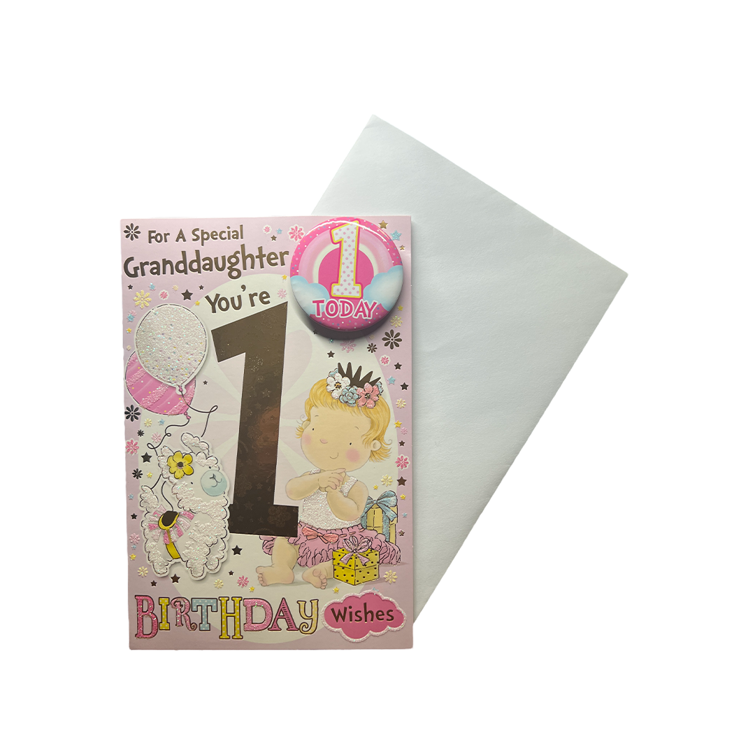 The Birthday Card for Granddaughter Age 1 is the perfect way to celebrate your Granddaughters first birthday. The card features an animated little one-year-old girl and her cute pet sheep design that is sure to delight any child. The card comes with a badge and envelope, making it a complete gift package that is perfect for a first birthday celebration.