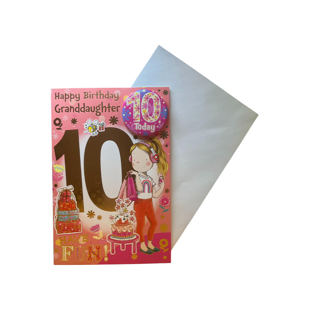 Make your granddaughter's 10th birthday extra special with this Birthday Card! Featuring an animated design of a girl listening to music, this card is sure to delight your granddaughter and show her how much you care. The card comes with an envelope and a badge that your granddaughter can proudly wear to celebrate her special day.