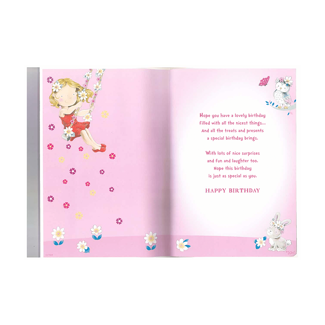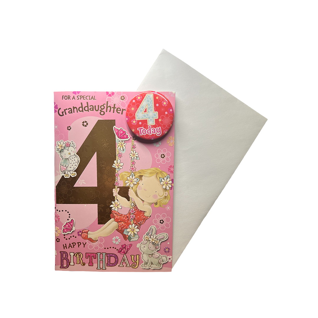 Celebrate your granddaughter's 4th birthday with this animated birthday card. The card features an adorable design of a little girl playing on a swing with her cute pet bunny next to her, designed to help your granddaughter express herself and celebrate her special day. The card comes with a matching envelope and a cool badge that your granddaughter can wear with pride. This gift set is the perfect way to make your granddaughter's birthday extra special.