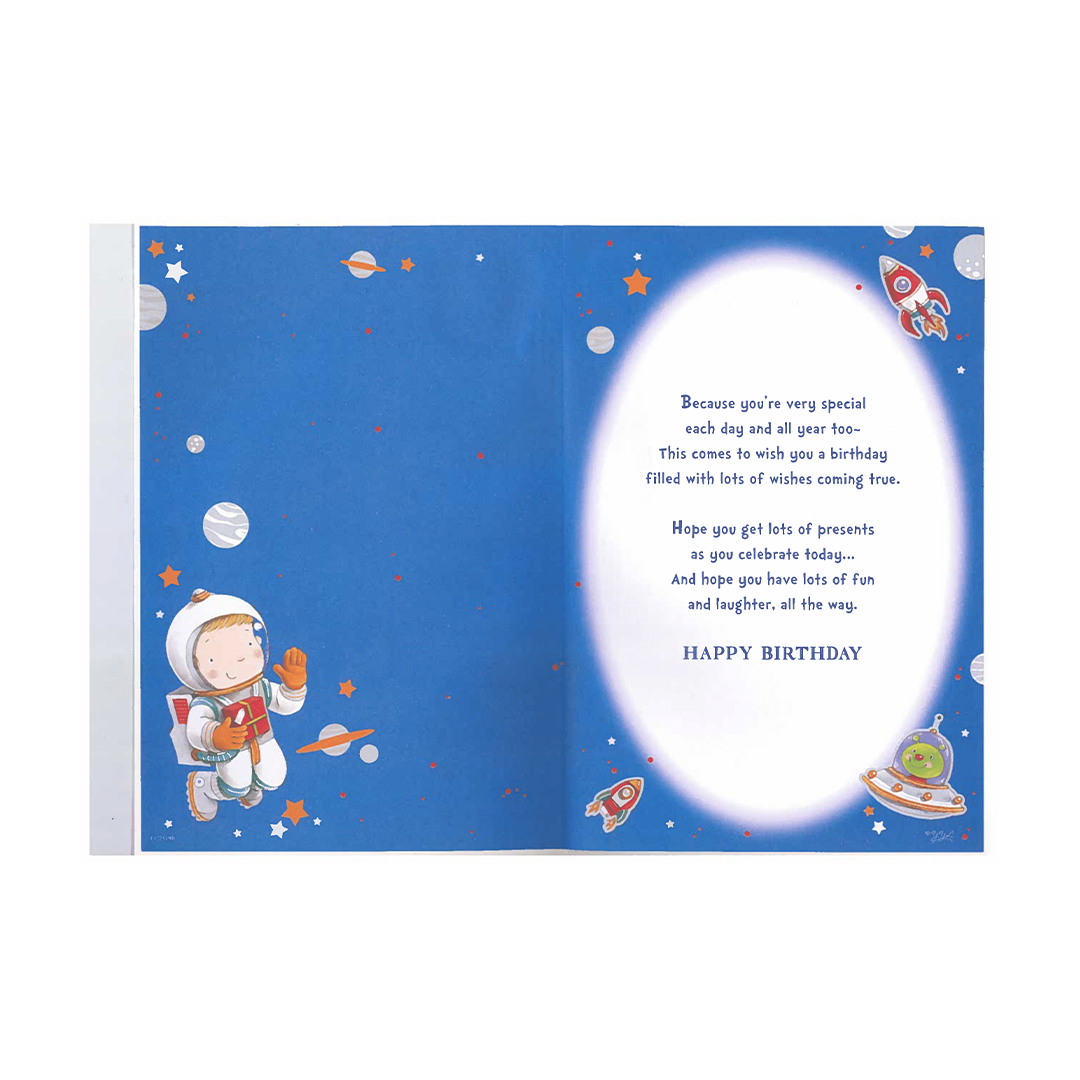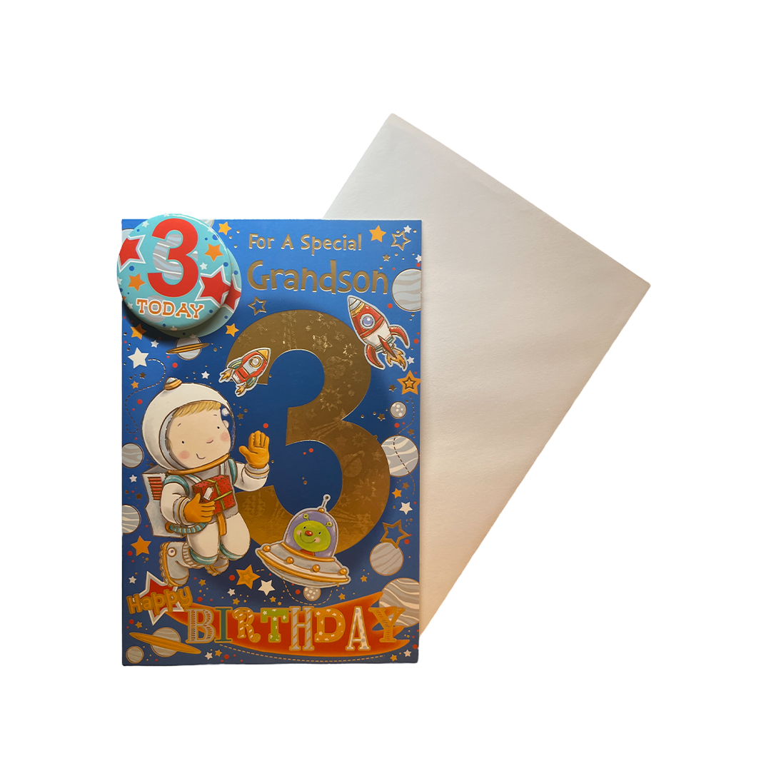 Celebrate your grandson's 3rd birthday with this fun and exciting "Blast Off!" birthday card. Featuring an animated little boy dressed up as an astronaut, this card is perfect for any young boy who loves space and adventure. The card comes with an envelope and a badge, making it the complete birthday package for your little one.