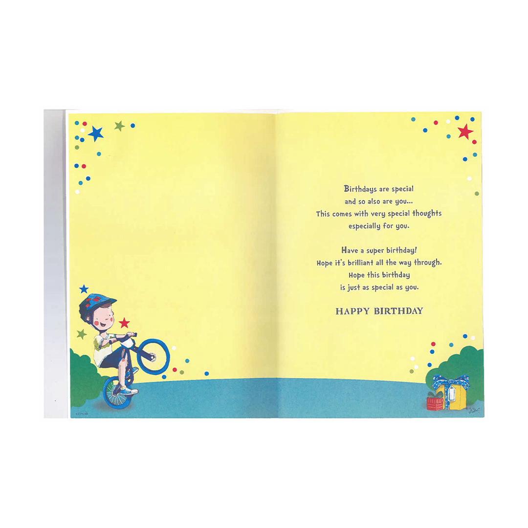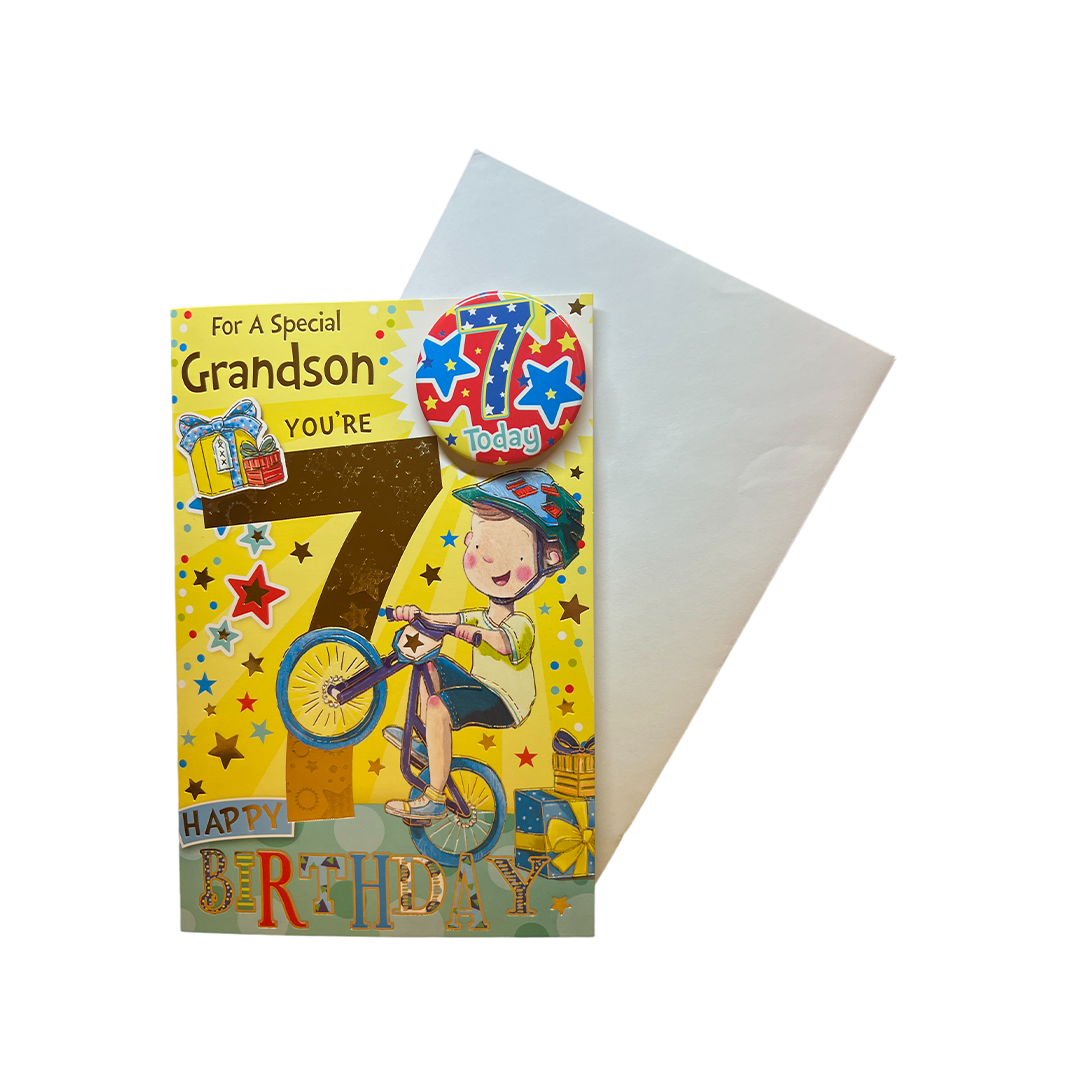 Make your grandson's birthday special with this birthday card that features an animated little boy riding his bike. The card includes an envelope and a badge, making it a complete package that your grandson will surely love. The card is made with high-quality materials, ensuring durability and long-lasting use.