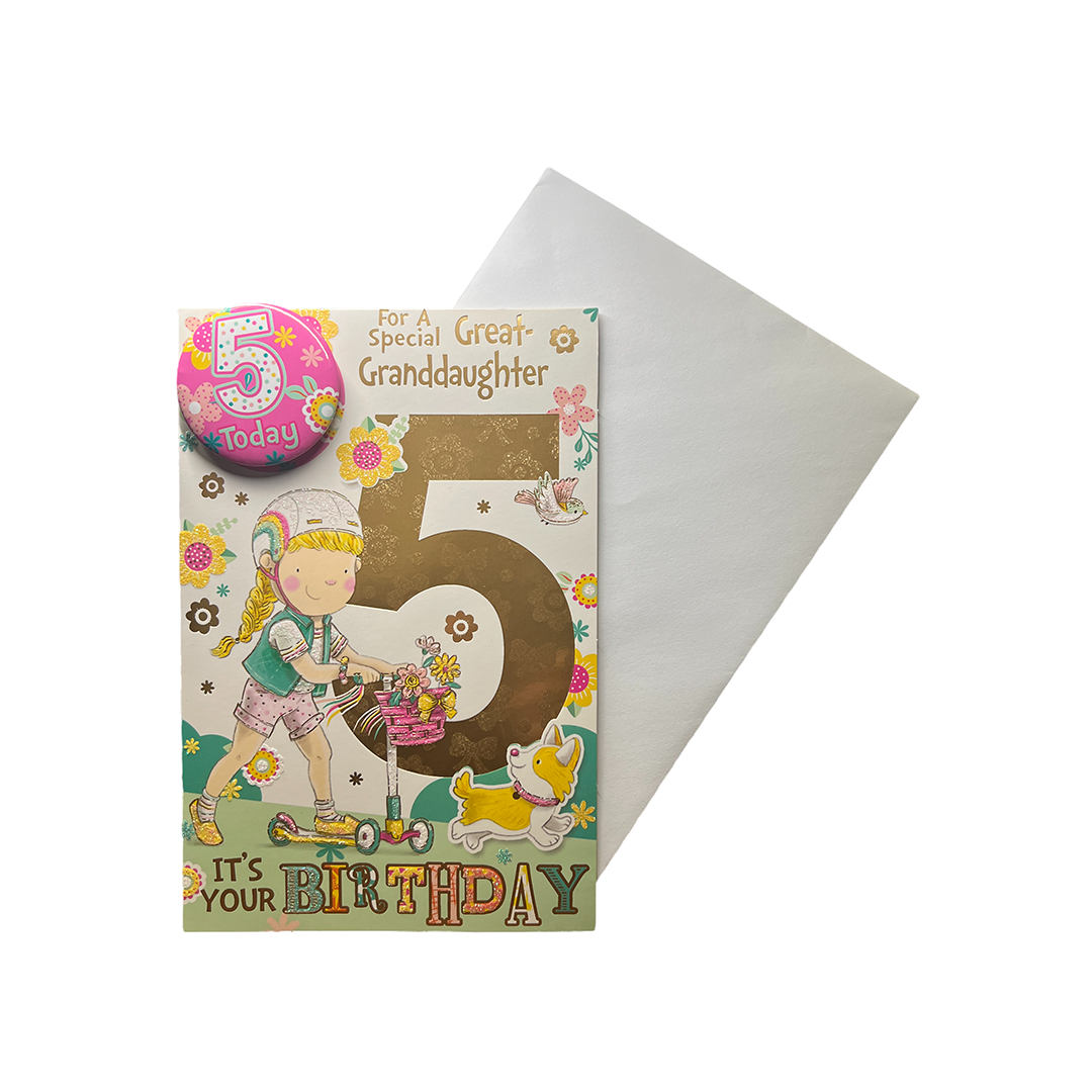 The Birthday Card for Great Granddaughter Age 5 is the perfect way to show your love and appreciation to your granddaughter on her special day. The card features an animated little 5-year-old girl and her pet dog design that is sure to put a smile on her face. The card comes with a badge and envelope, making it a complete gift package that is sure to delight any 5-year-old girl.