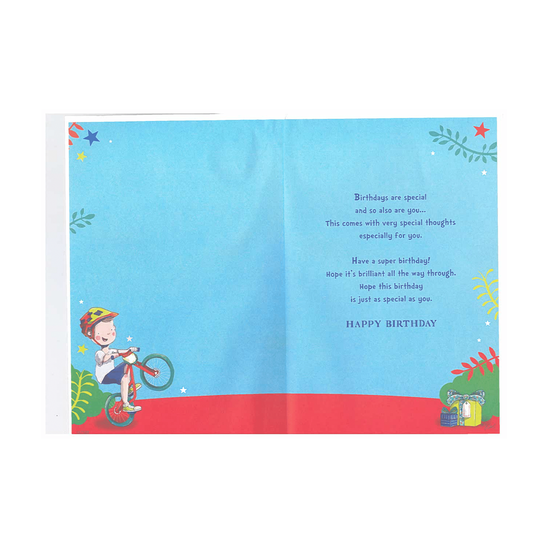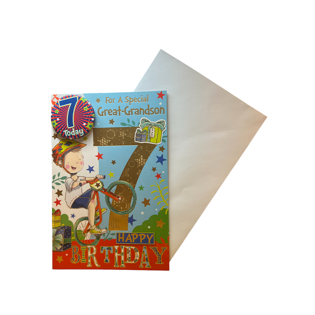 Celebrate your great grandson's special day with this fun and colorful birthday card. The design features an animated little boy riding his bike with a big smile on his face, perfect for the adventurous and active young boy. The card comes with an envelope and badge, making it a complete and thoughtful gift.