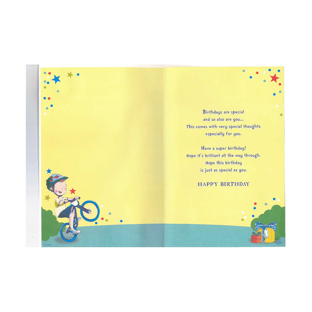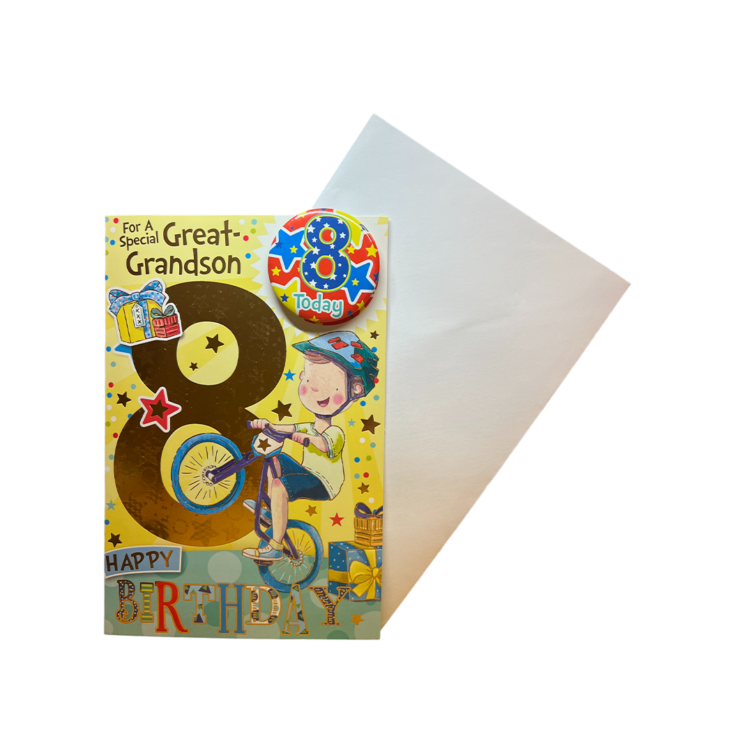 Make your great grandson's birthday extra special with this birthday card! Featuring an animated little boy riding his bike, this card is perfect for any young adventurer who loves the great outdoors. This card comes with an envelope and badge, making it a complete and thoughtful gift.