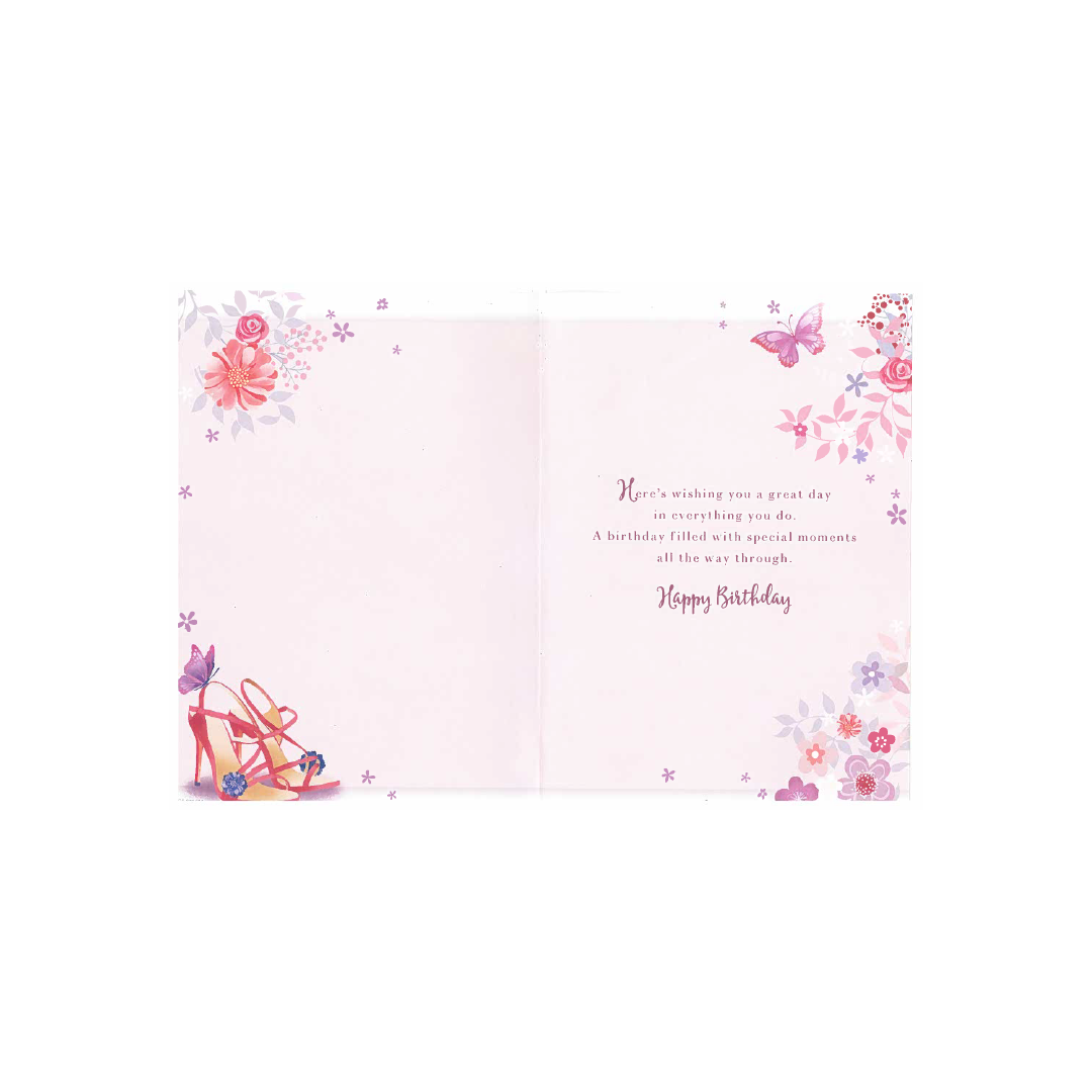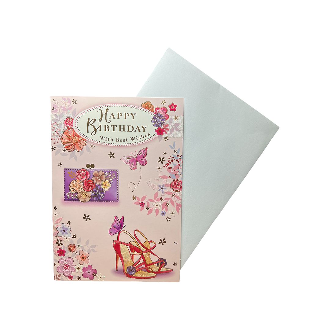 Looking for the perfect way to wish her a happy birthday! Look no further than the Birthday Card for Her. Featuring a stylish design with pink sandals on a pink background, this card is sure to make her smile. Measuring 19x13.3 centimetres, this card is the perfect size to send in the included envelope. Don't settle for an ordinary birthday card - express yourself with this stylish and unique card.