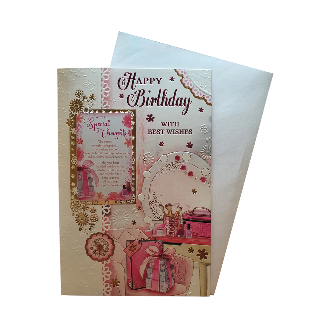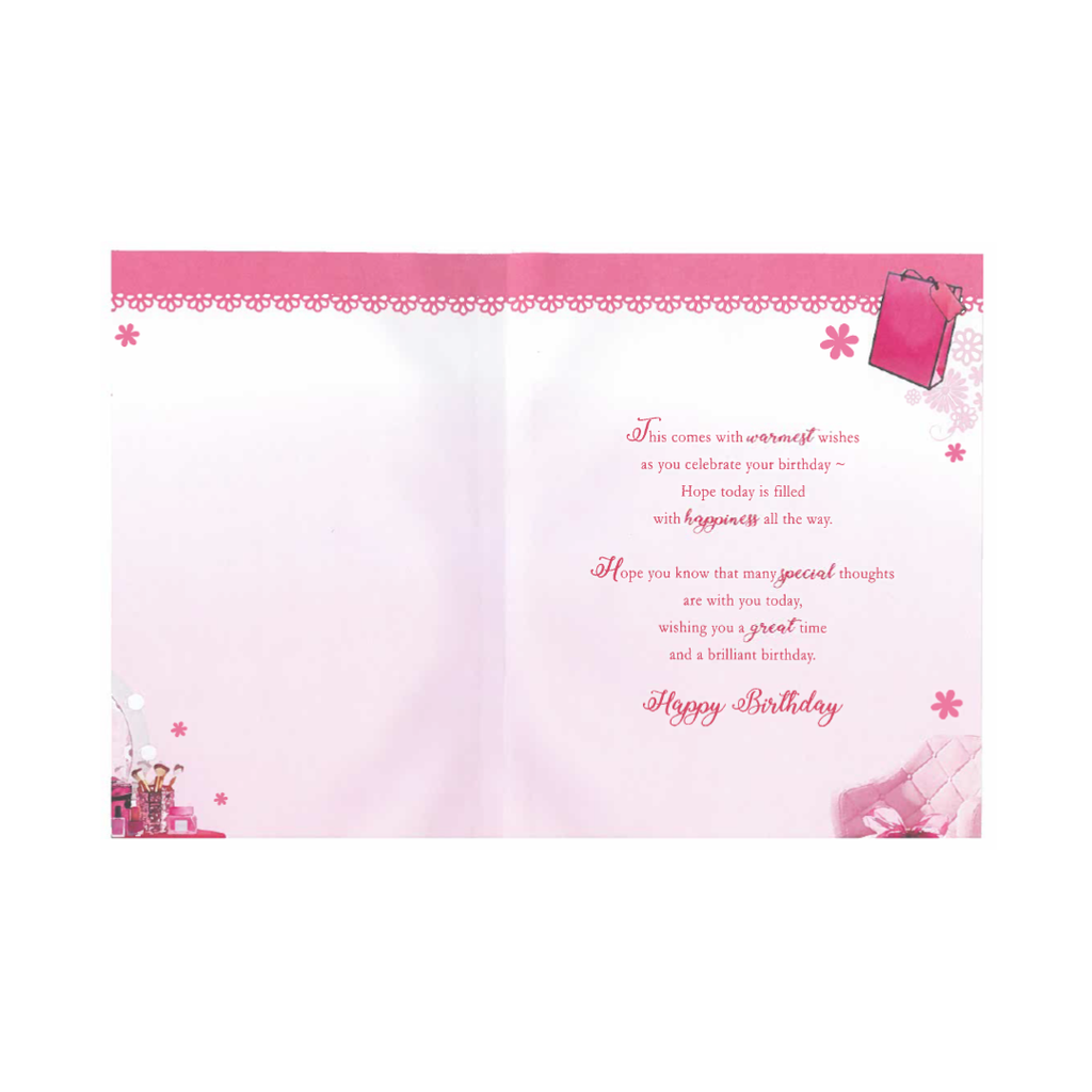 Celebrate her Happy Birthday with Birthday card Especially for her! Featuring Pink Colour and Makeup and Dressing Room card design for her. this card is sure to bring a smile to your face. The card also comes with an envelope and Keepsake, making it the perfect all-in-one gift. Crafted from high-quality materials, this birthday card is built to last and is perfect for showing your love and appreciation for her in your life.