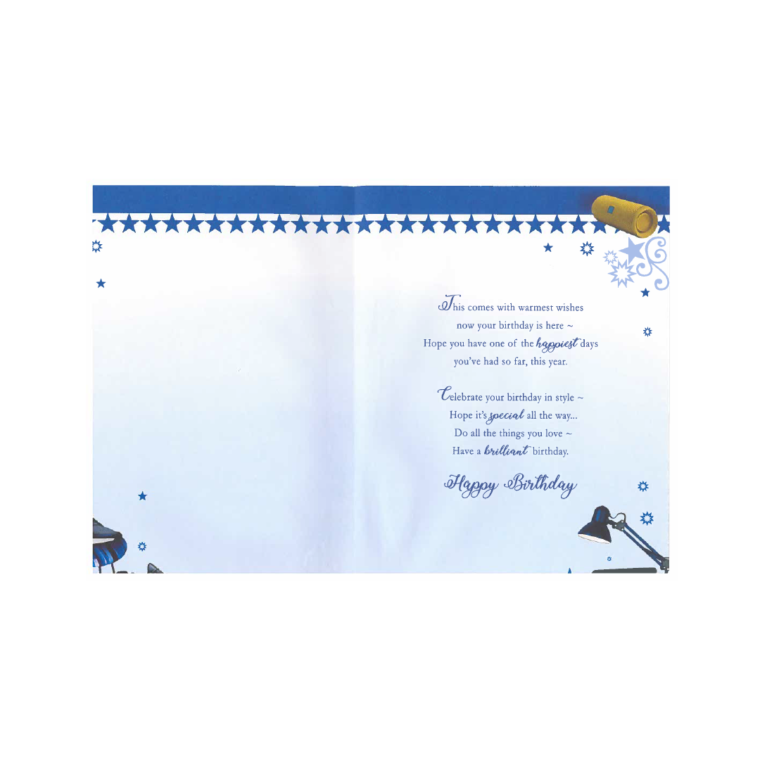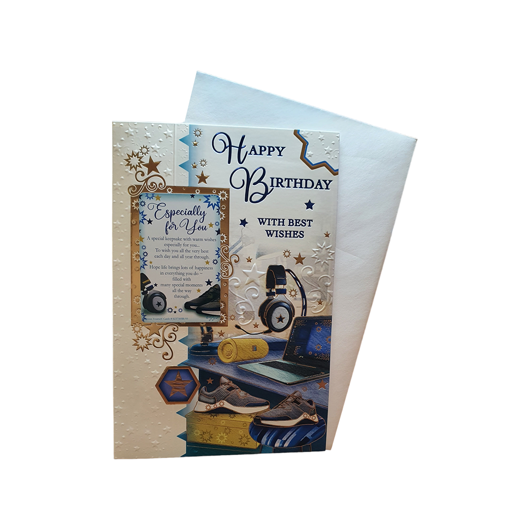 Celebrate Happy Birthday with Birthday card Especially for him! Featuring Laptop ,shoes , Headphone with blue colour design card for him. this card is sure to bring a smile to your face. The card also comes with an envelope and Keepsake, making it the perfect all-in-one gift. Crafted from high-quality materials, this birthday card is built to last and is perfect for showing your love and appreciation to your life.