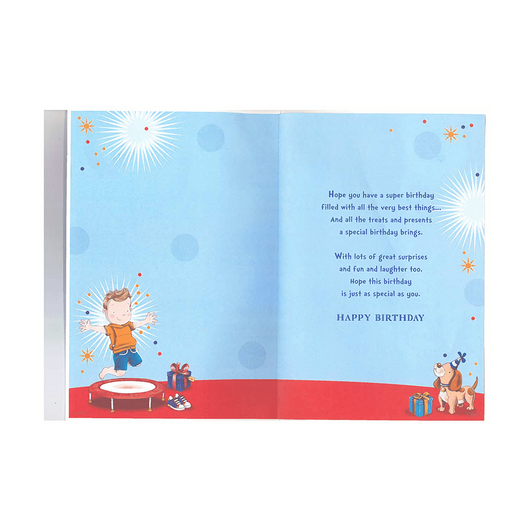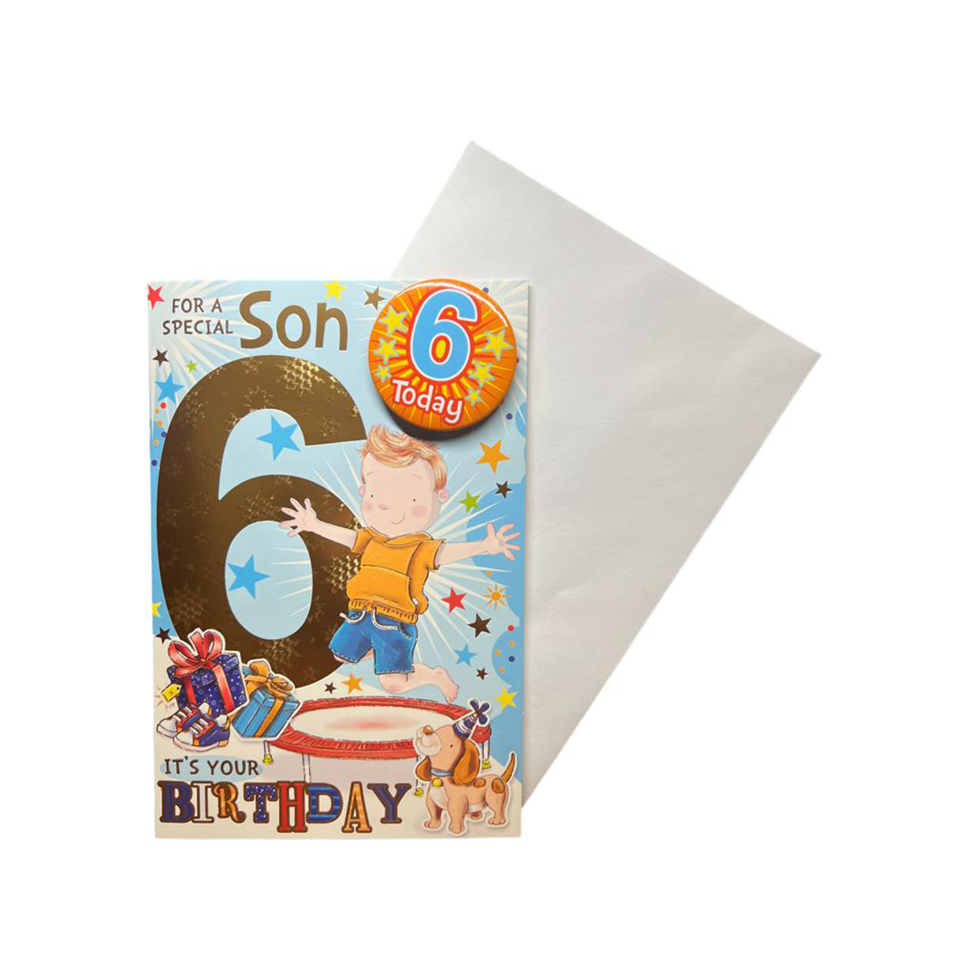 Celebrate your son's 6th birthday with this fun and colorful birthday card. Featuring an animated design of a little boy jumping on a trampoline, this card is perfect for any active and adventurous child. The card also includes a badge and envelope, making it a complete and thoughtful gift.