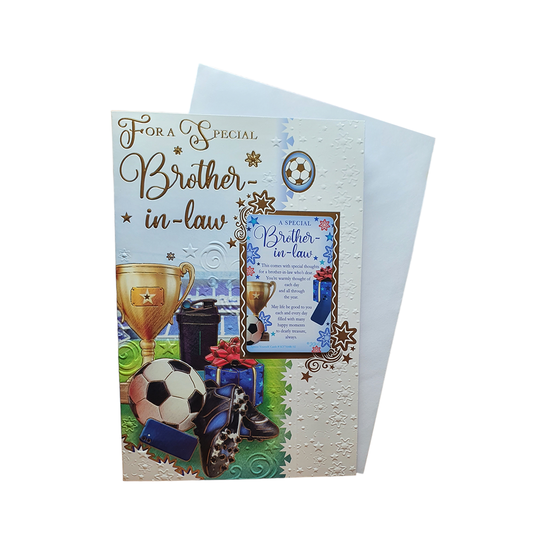 Celebrate your Special Brother-in-law Happy Birthday with Birthday card Especially for Special Brother-in-law! Featuring Football and Winning Trophy design card for Him. this card is sure to bring a smile to Special Brother-in-law's face. The card also comes with an envelope and Keepsake, making it the perfect all-in-one gift. Crafted from high-quality materials, this birthday card is built to last and is perfect for showing your love and appreciationfor the special Brother-in-law in your life.