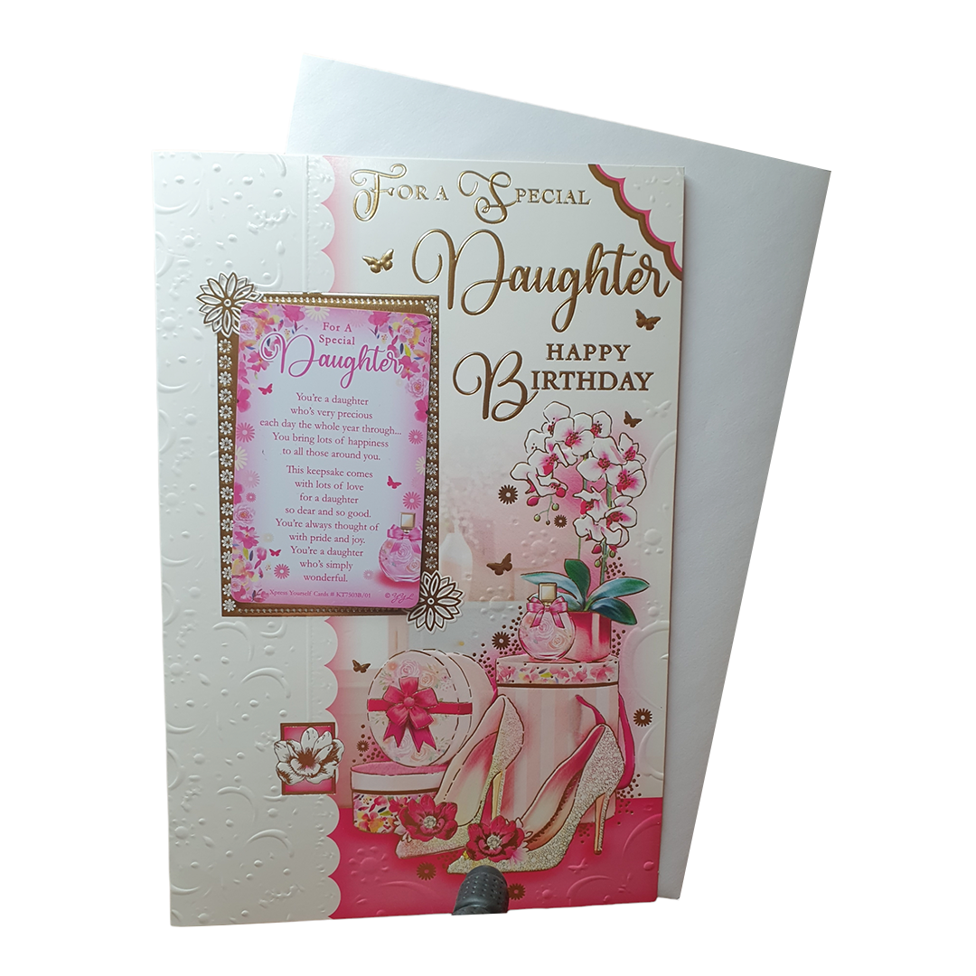 Celebrate your Special Daughter with Happy Birthday with Birthday card for your Special Daughter! Featuring Beautiful Pink Flower and high hill design for Her. this card is sure to bring a smile to your Special Daughter's face. The card also comes with an envelope and Keepsake, making it the perfect all-in-one gift. Crafted from high-quality materials, this birthday card is built to last and is perfect for showing your love and appreciation for the special Daughter in your life.