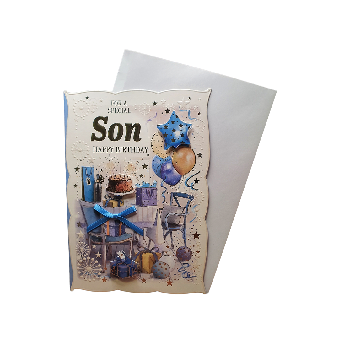 Celebrate your Special Son with Happy Birthday Wishes birthday card! Featuring a Blue Stain Ribbon attached and many more colourful balloons & Gifts, This card is sure to bring a smile to your special Son face. The card also comes with an envelope, making it the perfect all-in-one gift. Crafted from high-quality materials, this birthday card is built to last and is perfect for showing your love and appreciation for the special Son in your life.