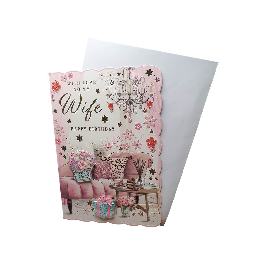 - Celebrate your wife with Happy Birthday Wishes birthday card! Featuring a Pink design of old house sofa and gift with best Happy birthday wishes , this card is sure to bring a smile to your lovely wife face.