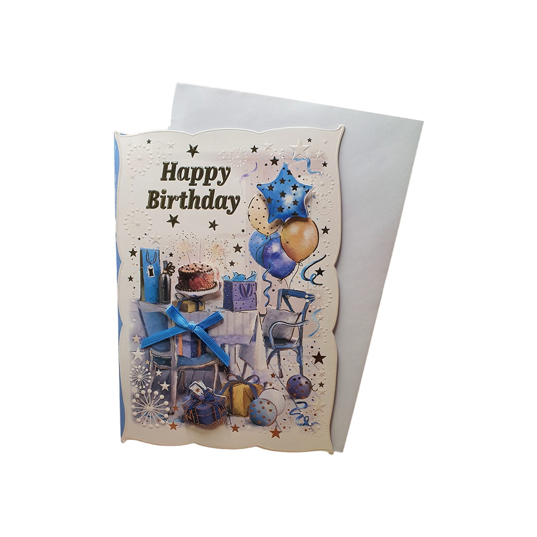 - Make birthdays even more special with our "Joyful Wishes" happy birthday card. birthday card! Featuring a Blue Stain Ribbon attached and many more colourful balloons & Gifts. a simple yet impactful "Happy Birthday" message, this card is suitable for all ages and personalities.