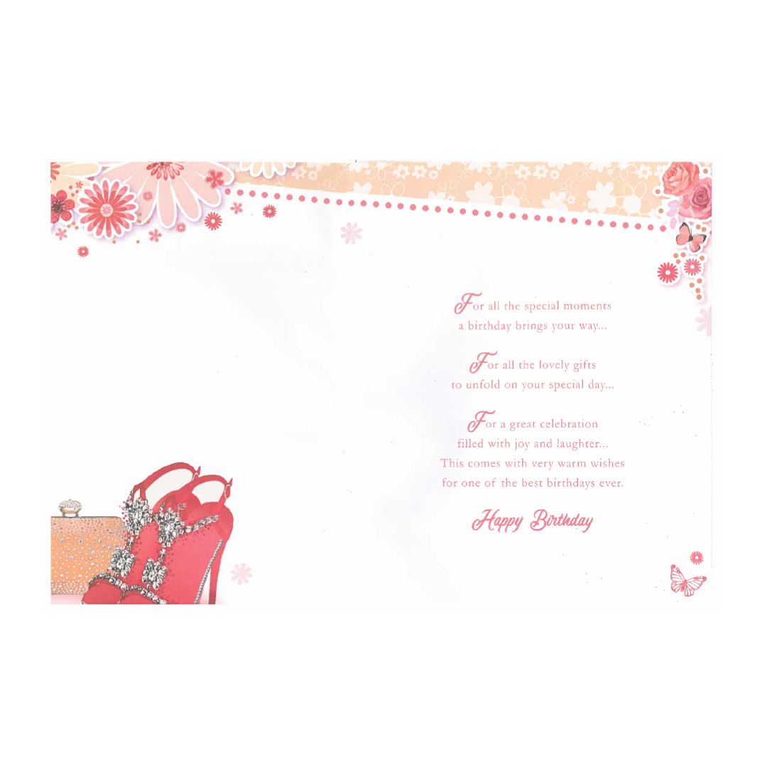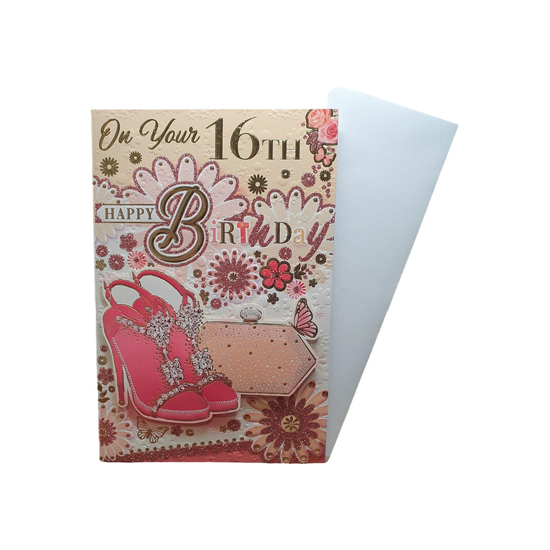Birthday Card On Your 16th Happy Birthday – Red western sandals with orange stylish purse and beautiful flowers decoration.