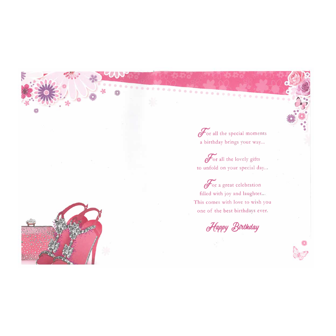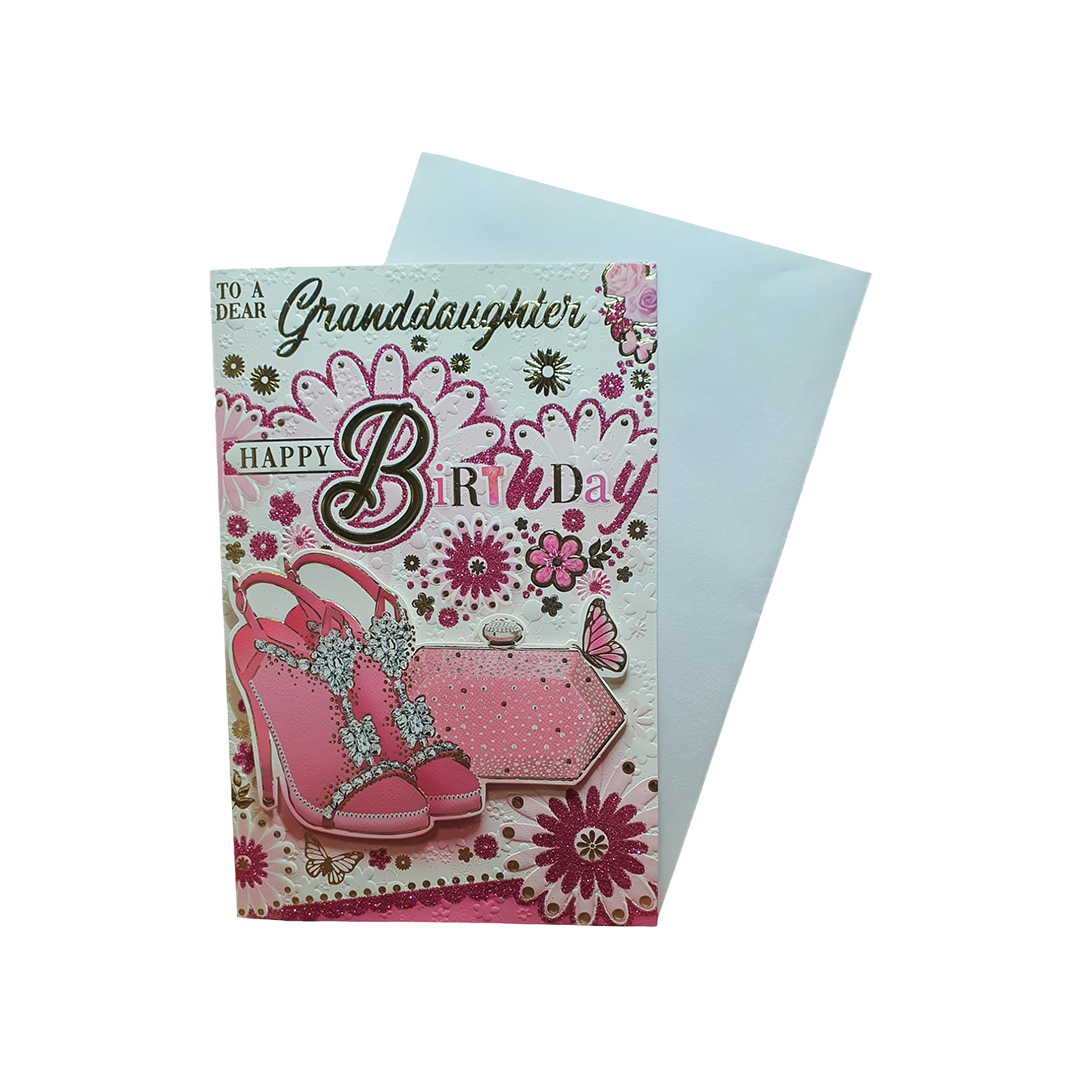 Birthday Card To Dear GrandDaughter – Pink sandals with designing purse and colourful flower design and decoration .