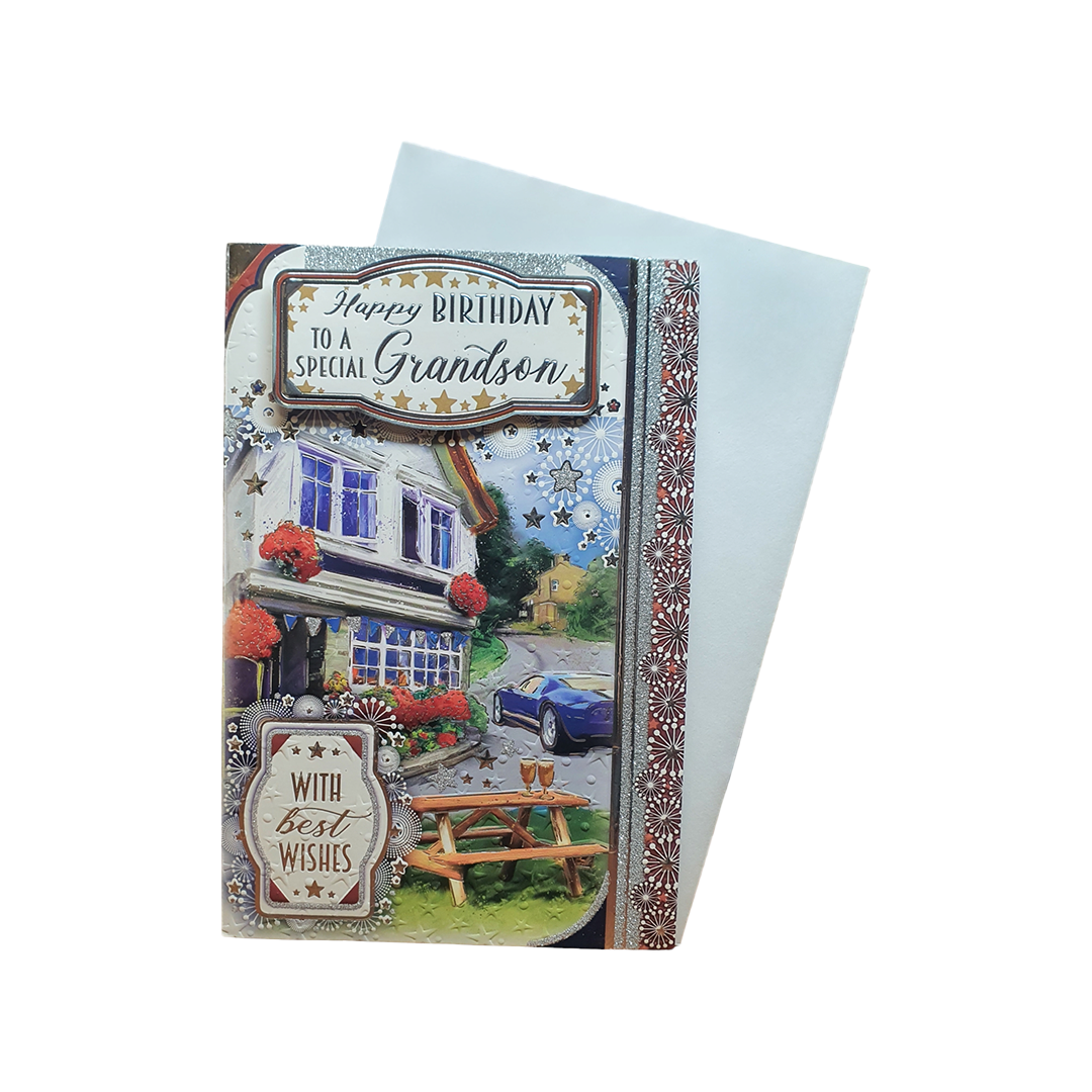 Birthday Card To Happy Birthday Special Grandson– One House near blue sporty car and one bench on 2 two wine glass.
