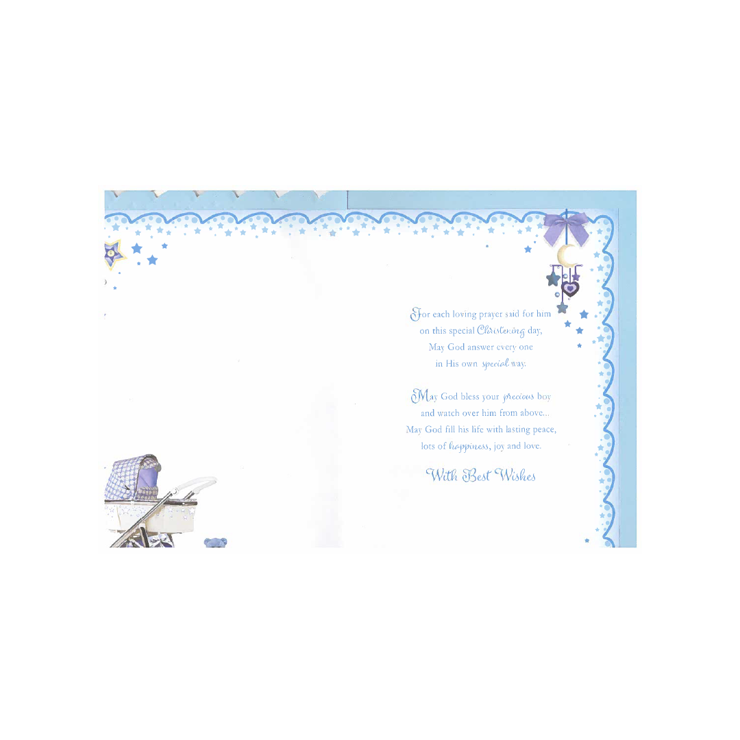Celebrate special Christening Card On Your Baby Boy's Christening Day Greeting Card This delightful card is the perfect way to convey your heartfelt Christening wishes and make the recipient's day even more joyful. With its vibrant design and thoughtful message, this card adds an extra layer of happiness and thoughtfulness to your Christening greetings.