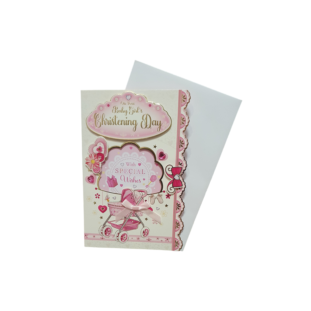 Celebrate special Christening Card On Your Baby Girl's Christening Day Greeting Card This delightful card is the perfect way to convey your heartfelt Christening wishes and make the recipient's day even more joyful. With its vibrant design and thoughtful message, this card adds an extra layer of happiness and thoughtfulness to your Christening greetings.