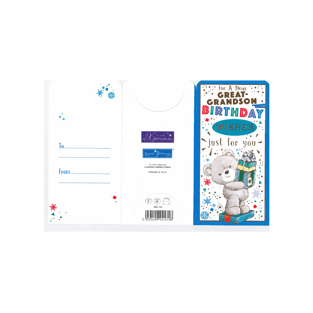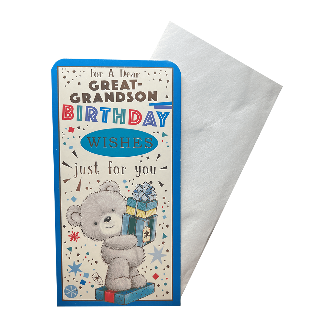 Celebrate your Special Great Grandson special day in style with our Money Wallet Gift Card! This beautifully designed gift card is the perfect birthday present for your beloved Great Grandson. Featuring a vibrant and colorful design, this gift card is sure to bring a smile to him face. The card comes with a matching envelope, adding an extra touch of elegance to your gift.The inside of the card is left blank, allowing you to personalize it with your own heartfelt message. Simply fill in the 'from' and 'to' information, and your gift is ready to go!
