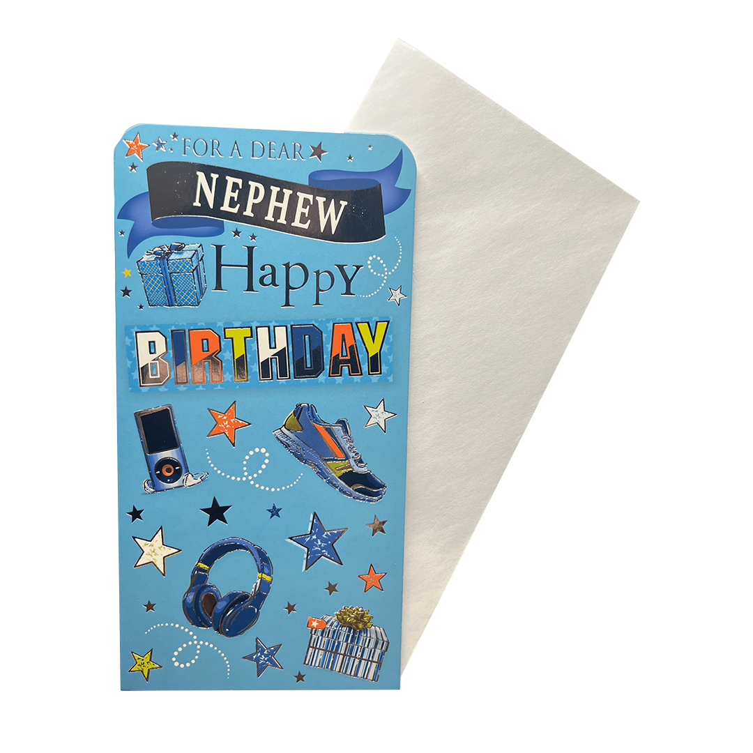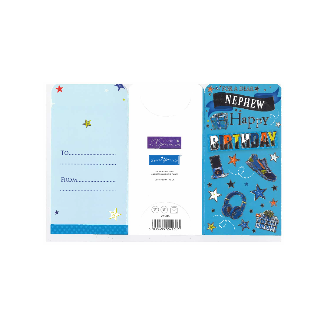 Celebrate your Nephew special day in style with our Money Wallet Gift Card! This beautifully designed gift card is the perfect birthday present for your beloved Nephew. Featuring a vibrant and colorful design, this gift card is sure to bring a smile to him face. The card comes with a matching envelope, adding an extra touch of elegance to your gift.The inside of the card is left blank, allowing you to personalize it with your own heartfelt message. Simply fill in the 'from' and 'to' information, and your gift is ready to go!
