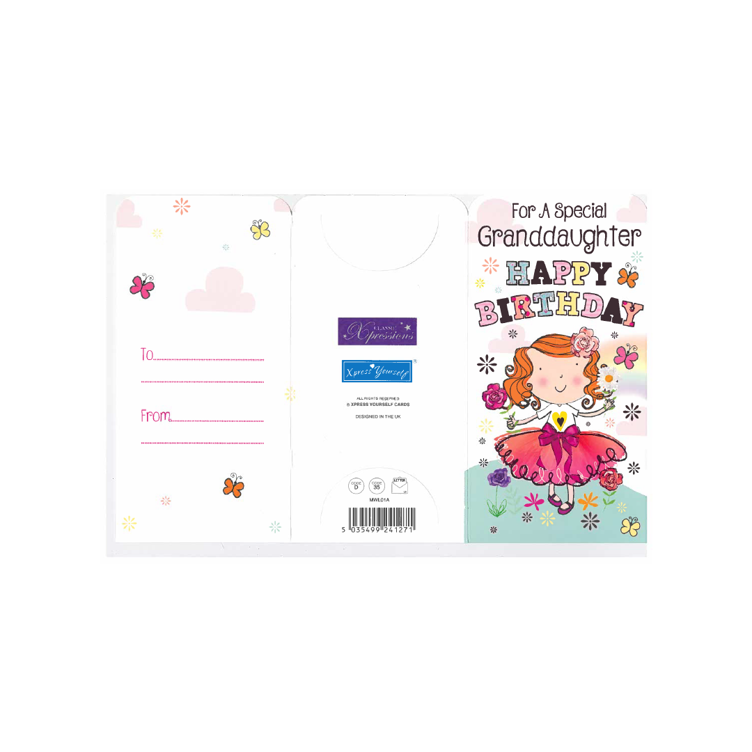 Celebrate your Granddaughter special day in style with our Money Wallet Gift Card! This beautifully designed gift card is the perfect birthday present for your beloved Granddaughter. Featuring a vibrant and colorful design, this gift card is sure to bring a smile to her face. The card comes with a matching envelope, adding an extra touch of elegance to your gift.The inside of the card is left blank, allowing you to personalize it with your own heartfelt message. Simply fill in the 'from' and 'to' information, and your gift is ready to go!