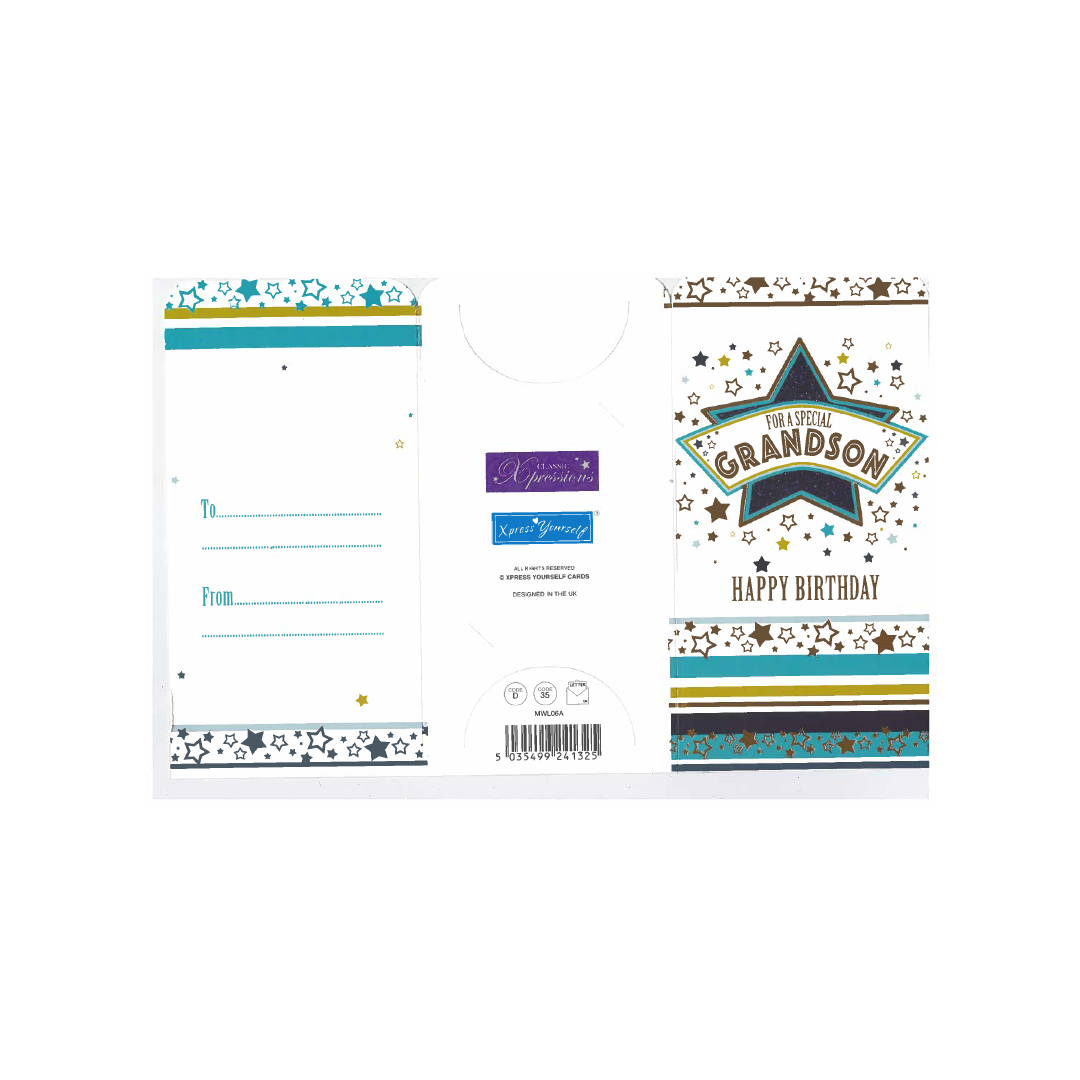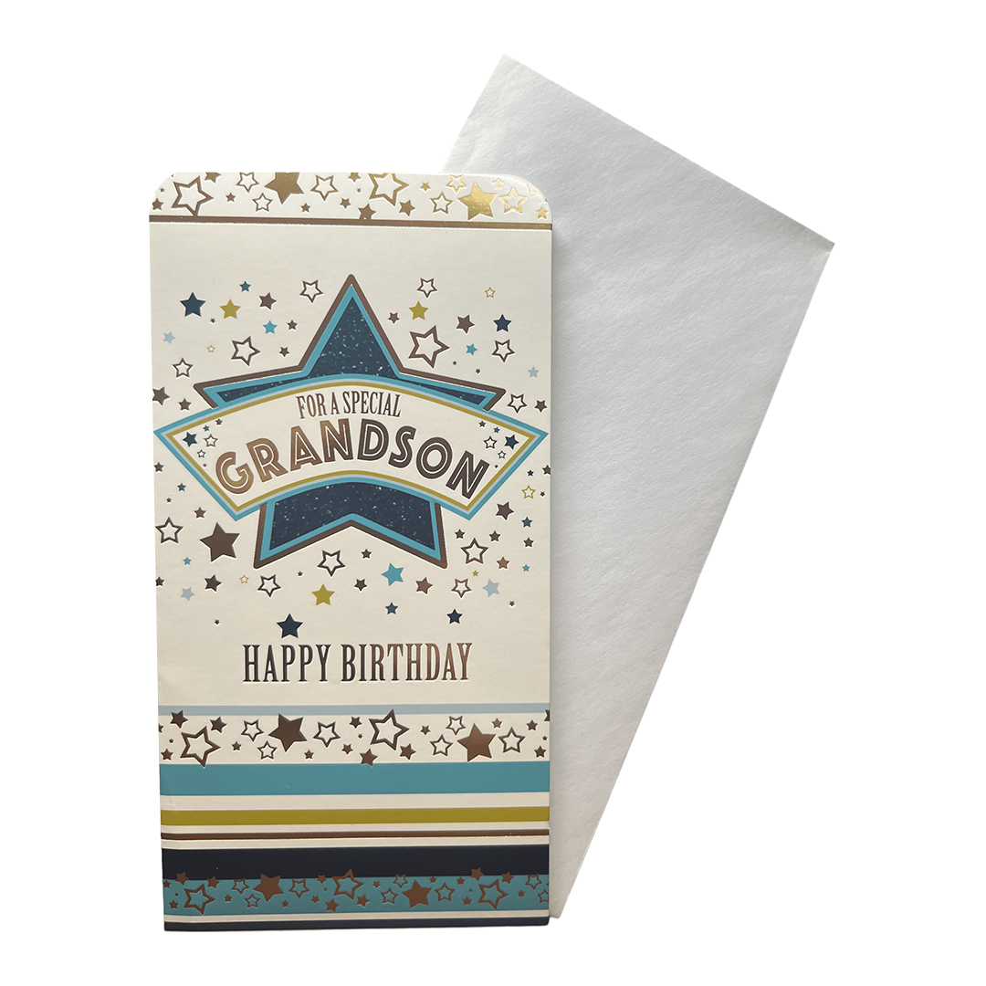 Celebrate your Grandson special day in style with our Money Wallet Gift Card! This beautifully designed gift card is the perfect birthday present for your beloved Grandson.Featuring a vibrant and colorful design, this gift card is sure to bring a smile to him face. The card comes with a matching envelope, adding an extra touch of elegance to your gift.The inside of the card is left blank, allowing you to personalize it with your own heartfelt message. Simply fill in the 'from' and 'to' information, and your gift is ready to go!