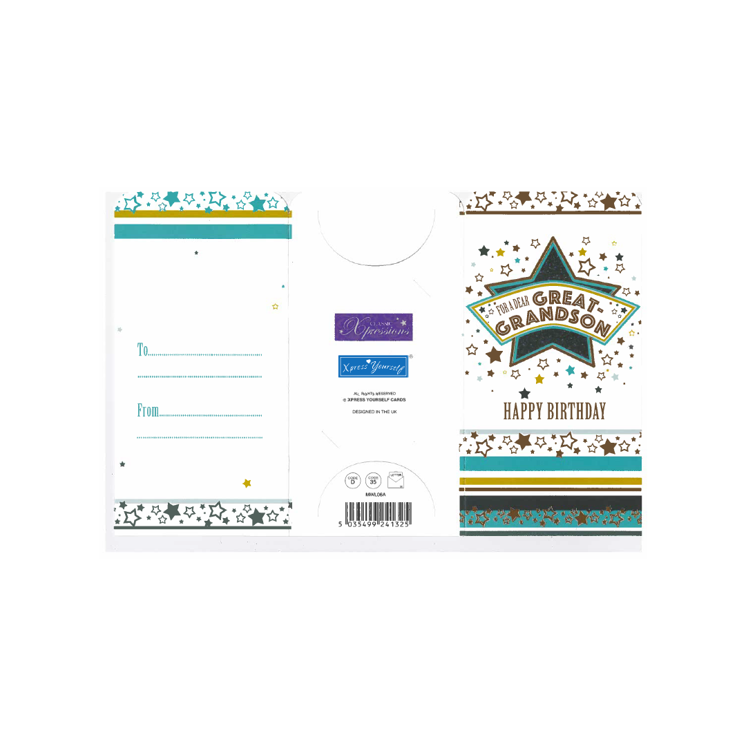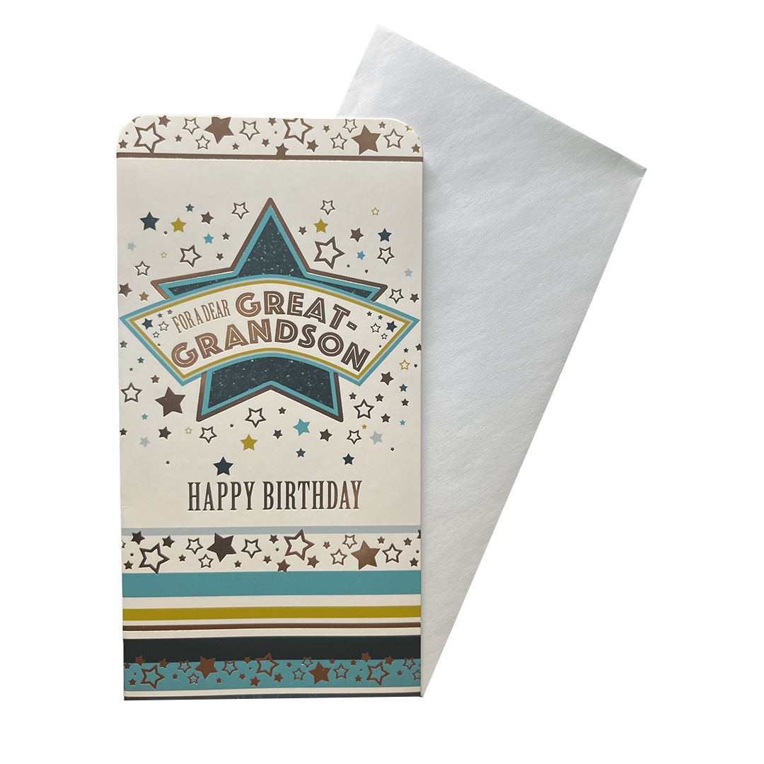 Celebrate your Great Grandson special day in style with our Money Wallet Gift Card! This beautifully designed gift card is the perfect birthday present for your beloved Grandson.Featuring a vibrant and colorful design, this gift card is sure to bring a smile to him face. The card comes with a matching envelope, adding an extra touch of elegance to your gift.The inside of the card is left blank, allowing you to personalize it with your own heartfelt message. Simply fill in the 'from' and 'to' information, and your gift is ready to go!