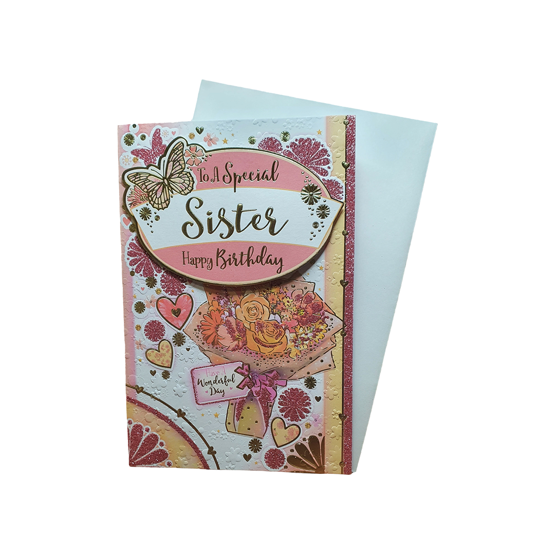 Birthday card for special Sister. This delightful card is the perfect way to convey your heartfelt birthday wishes and make the celebrant's day even brighter. With its cheerful design and warm message, this card will bring smiles and joy to the birthday girl, making their day truly memorable.