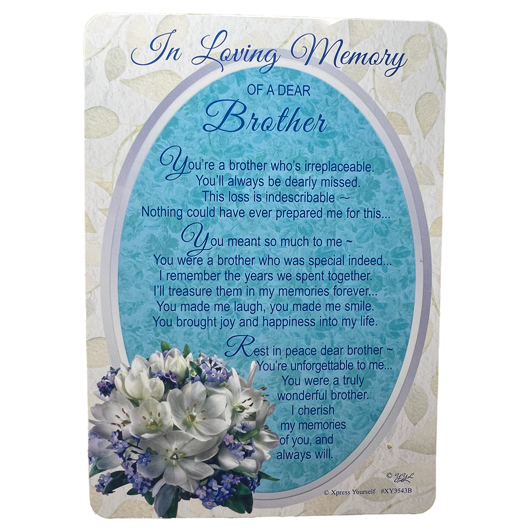 This "Express Yourself" Graveside Keepsake is a wonderful way to honor the memory of your beloved brother. Featuring a beautiful lilies flower design on a blue font, this keepsake will bring a sense of peace and comfort to your heart every time you visit your brother's resting place. The back of the card is left blank, providing ample space to write a personal message or add a cherished photograph.