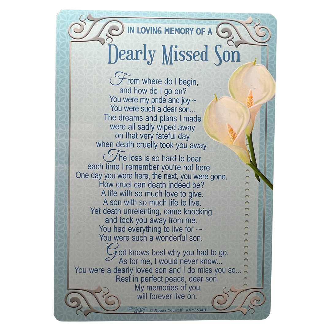 This plastic graveside keepsake from the "Express Yourself" brand provides a beautiful way to commemorate and honor the memory of your dearly missed son. Featuring a touching lilies flower design on a blue font, this plaque measures 15 x 10.5 centimeters, making it a fitting tribute for any gravesite. The back of the card includes an empty template for you to write a personal message to your son. The high-quality printing ensures the design is clear and easy to read, while the durable plastic construction makes it suitable for indoor or outdoor use.