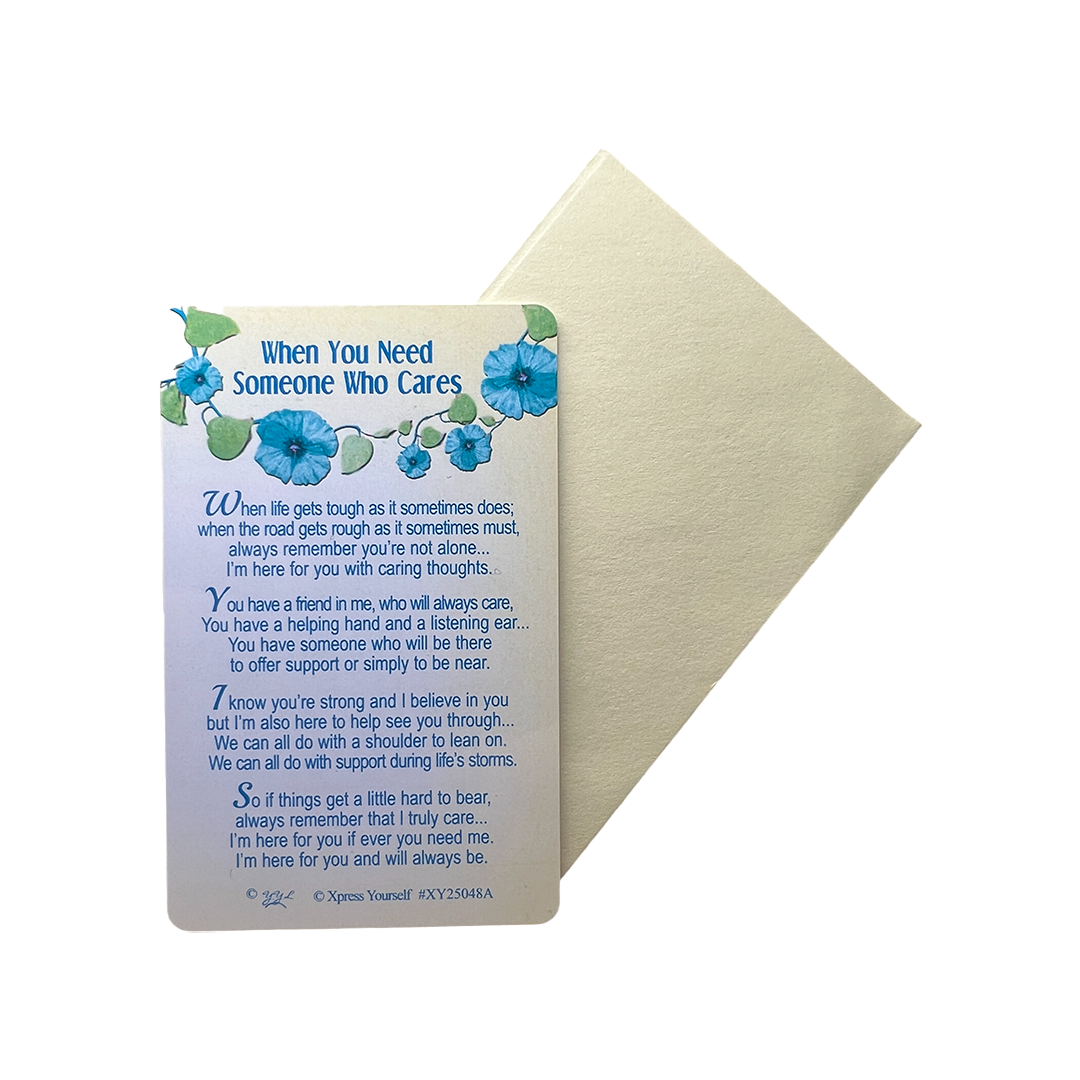 "Express your care and support with this ""When You Need Someone Who Cares"" plastic keepsake from Express Yourself. Measuring 8.5 x 5.4 cm, this beautifully designed card comes with an envelope of the same size, making it perfect for easy mailing or gifting. The back of the card features space to write down the names of the sender and the recipient, adding a personal touch to your thoughtful gesture. Whether you're looking for a way to show your friend, family member, or loved one that you're there for them during difficult times, this keepsake is an ideal choice. With its heartfelt message and charming design, it's sure to bring a smile to anyone's face. Made with high-quality materials and attention to detail, this plastic keepsake is built to last and serve as a lasting reminder of your care and support. Don't hesitate to order yours today and make someone's day brighter!"