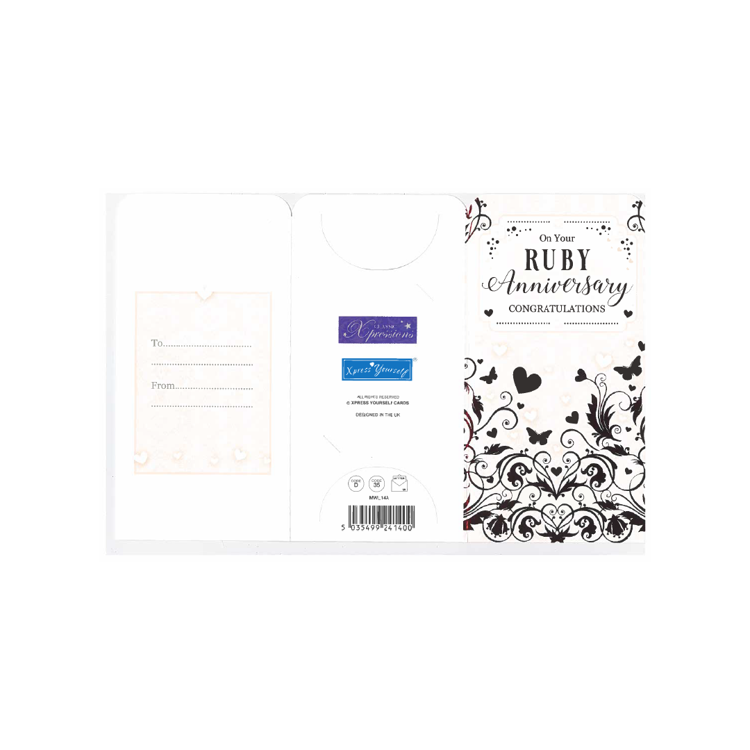 Celebrate four decades of love, devotion, and cherished memories with our exquisite Ruby Wedding Anniversary Money Wallet Gift Card!, a radiant token of admiration and congratulations for the happy couple. This beautifully designed gift card is the perfect Ruby Wedding Anniversary present for your Love.Featuring a vibrant and colorful design, this gift card is sure to bring a smile to loved one face. The card comes with a matching envelope, adding an extra touch of elegance to your gift.The inside of the card is left blank, allowing you to personalize it with your own heartfelt message. Simply fill in the 'from' and 'to' information, and your gift is ready to go!