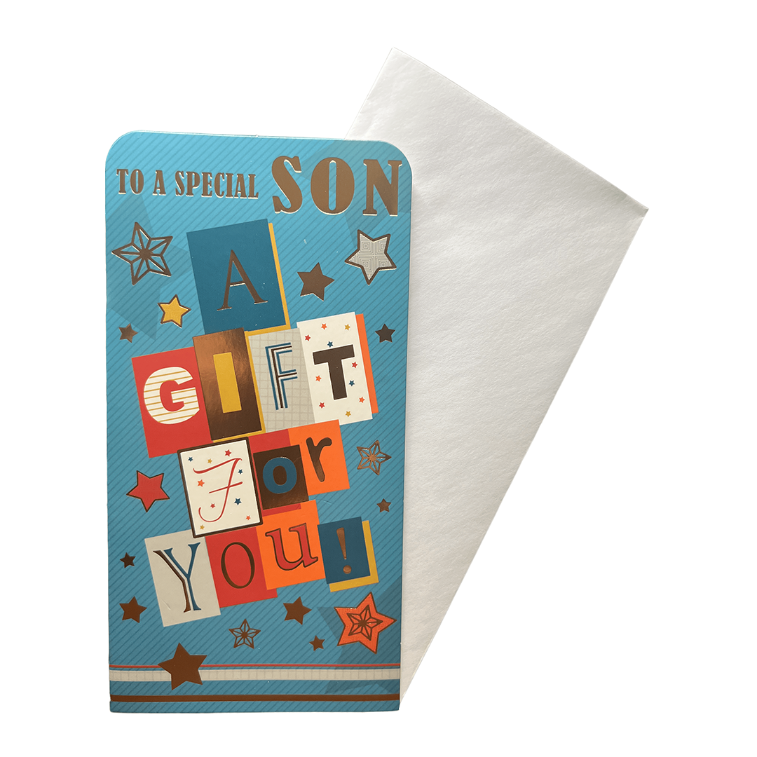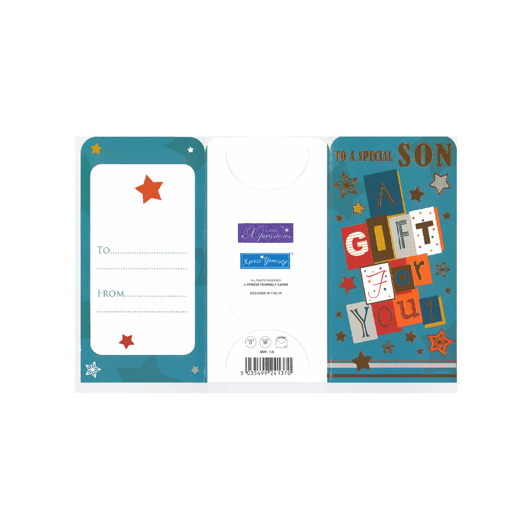 Celebrate your Son special day in style with our Money Wallet Gift Card! This beautifully designed gift card is the perfect birthday present for your beloved Son.Featuring a vibrant and colorful design, this gift card is sure to bring a smile to him face. The card comes with a matching envelope, adding an extra touch of elegance to your gift.The inside of the card is left blank, allowing you to personalize it with your own heartfelt message. Simply fill in the 'from' and 'to' information, and your gift is ready to go!